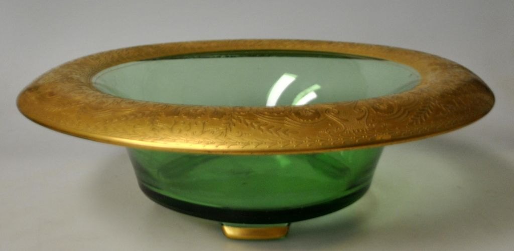 Art deco bordskål, L. Moser & Söhne, Karlsbad, ca. 1920. Frugtskål af grønt glas med forgyldt kant. Kantdekoration i form af blomster. Forgyldning på de tre ben. H.: 9 cm. Dia.: 28 cm.