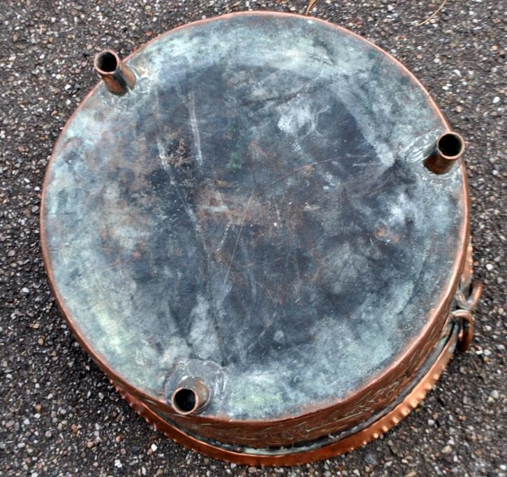 Brændespand, Haraldskjær Kobber Fabrik, Vejle, 19. årh. Danmark. Med tre ben og to hanke. Med tarige bankede dekorationer på siden. H.: 29 cm. Dia.: 40 cm.  Perfekt stand!