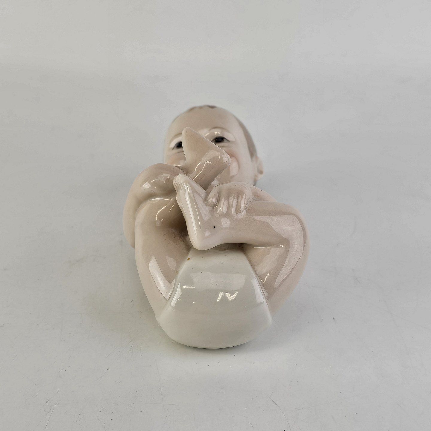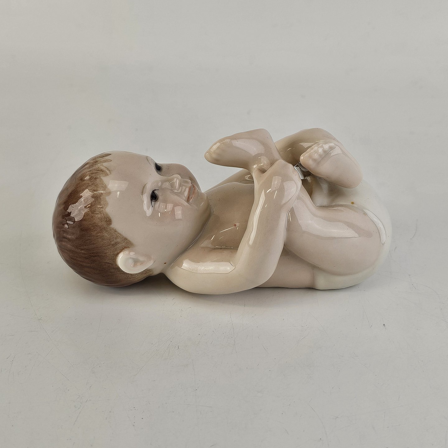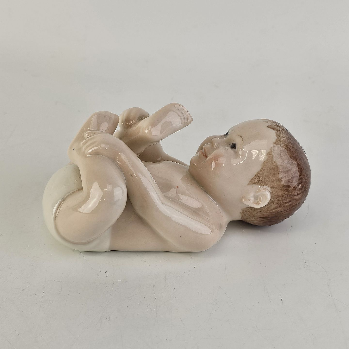 Figur i porcelæn med motiv af liggende baby med hvid ble. Nr. 027