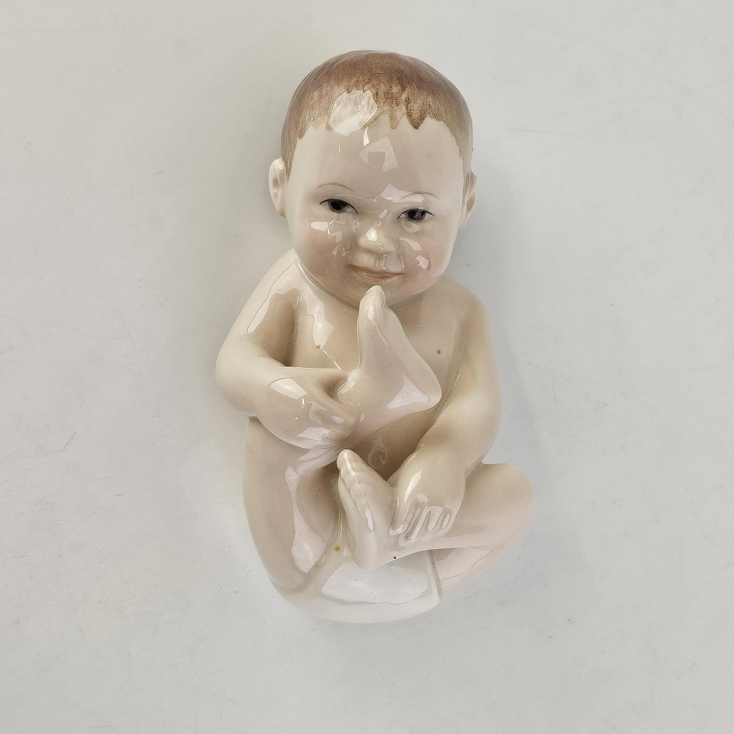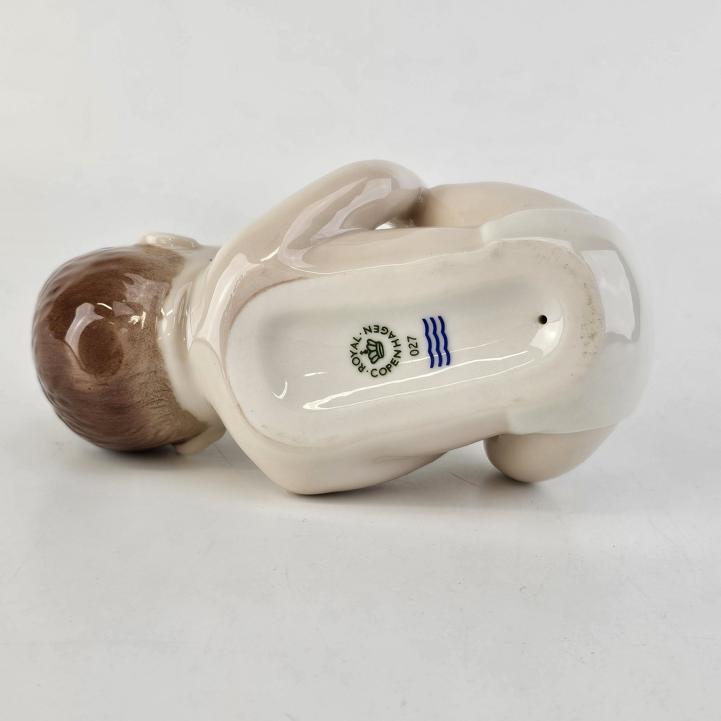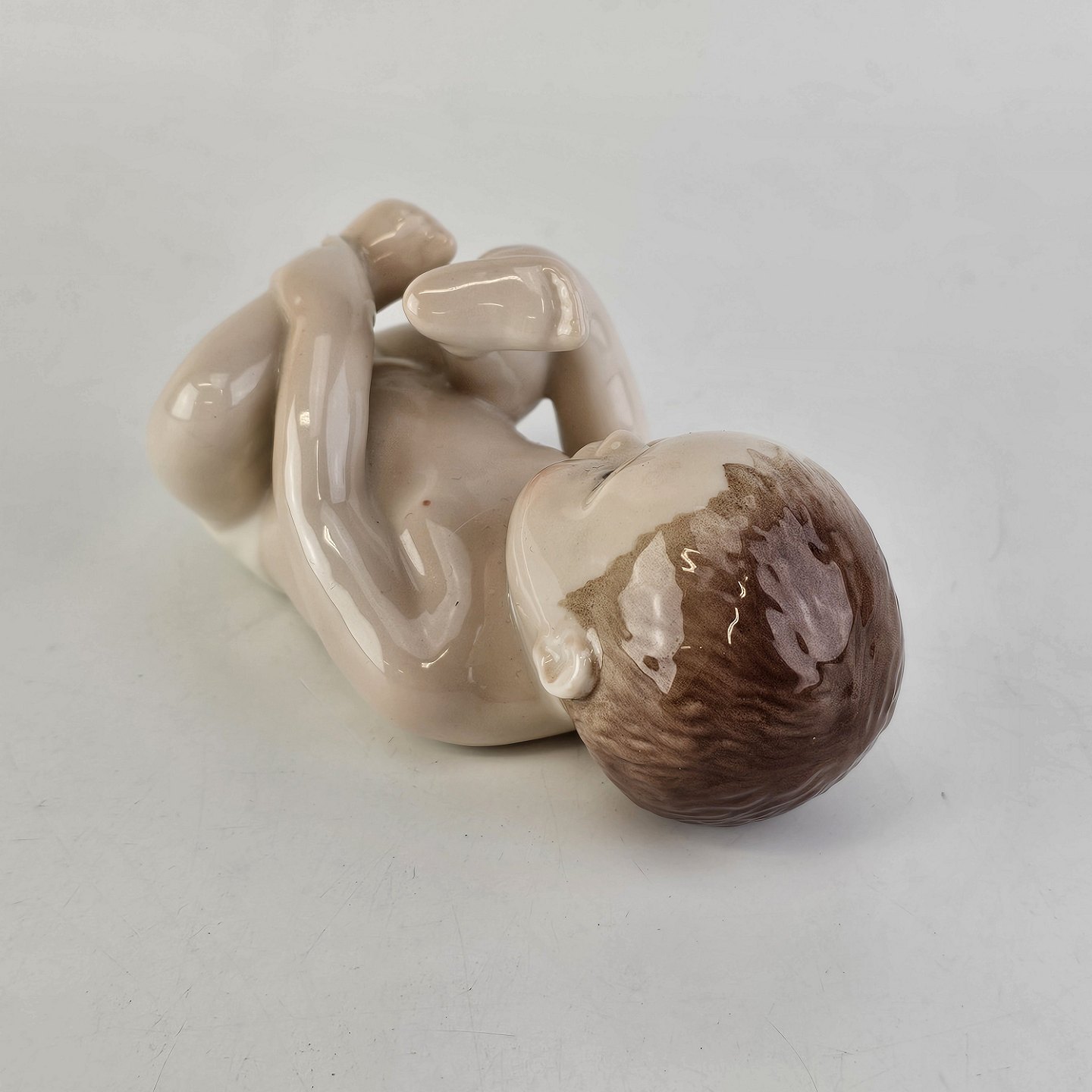 Figur i porcelæn med motiv af liggende baby med hvid ble. Nr. 027