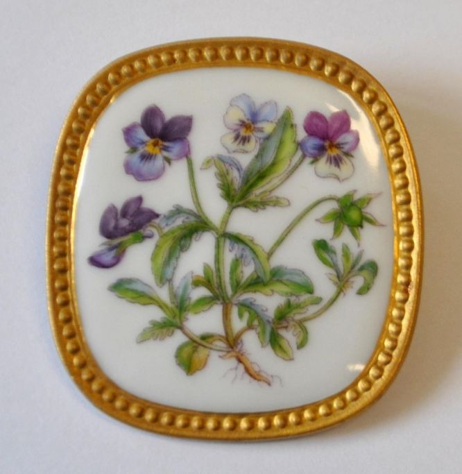 Michelsen for Royal Copenhagen. "Flora Danica" broche / vedhæng i porcelæn og sterlingsølv 20. årh. Håndmalede blomster dekorationer og forgyldninger. Stemplet. 5 x 4,5 cm.