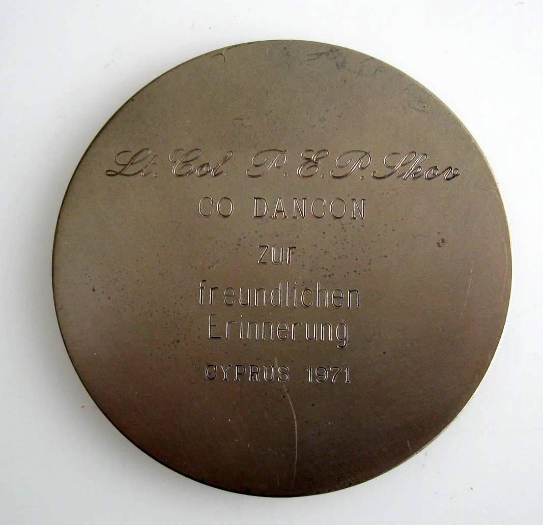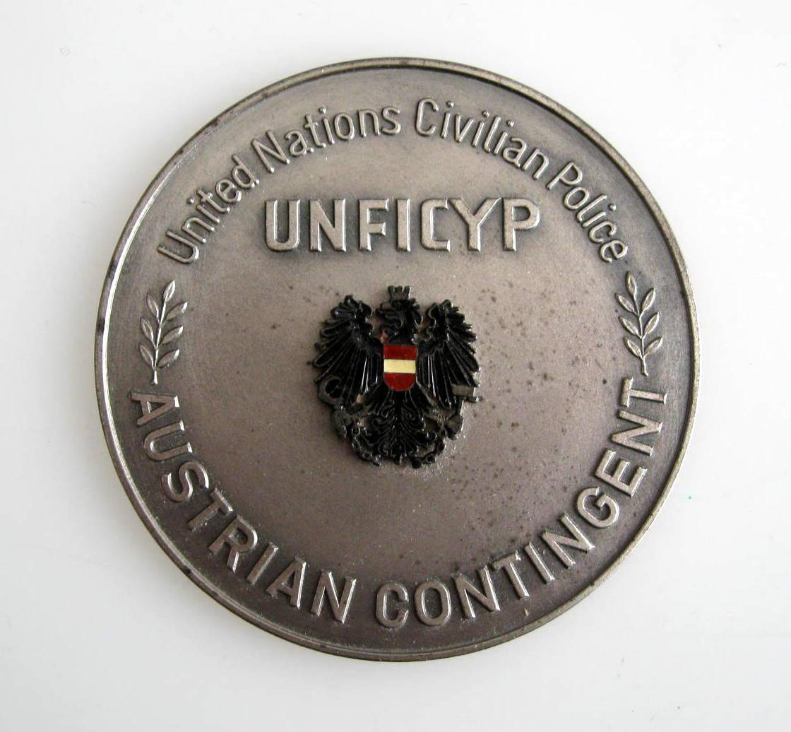 FN medalje - United Nations Civilian Police - Unficyp. Austrian Contingent. Dia.: 7,5 cm. Metal med emalje. Med inskription.: Lt. Col. P.E.P. Skov CO DANCON zur freundlichen Erinnerung, CYPRUS 1971. I orignial æske. Proveniens: Oberstløjtnant Poul Ervin O. Skov, Øverstkommanderende Dancon XIV, Cypern.