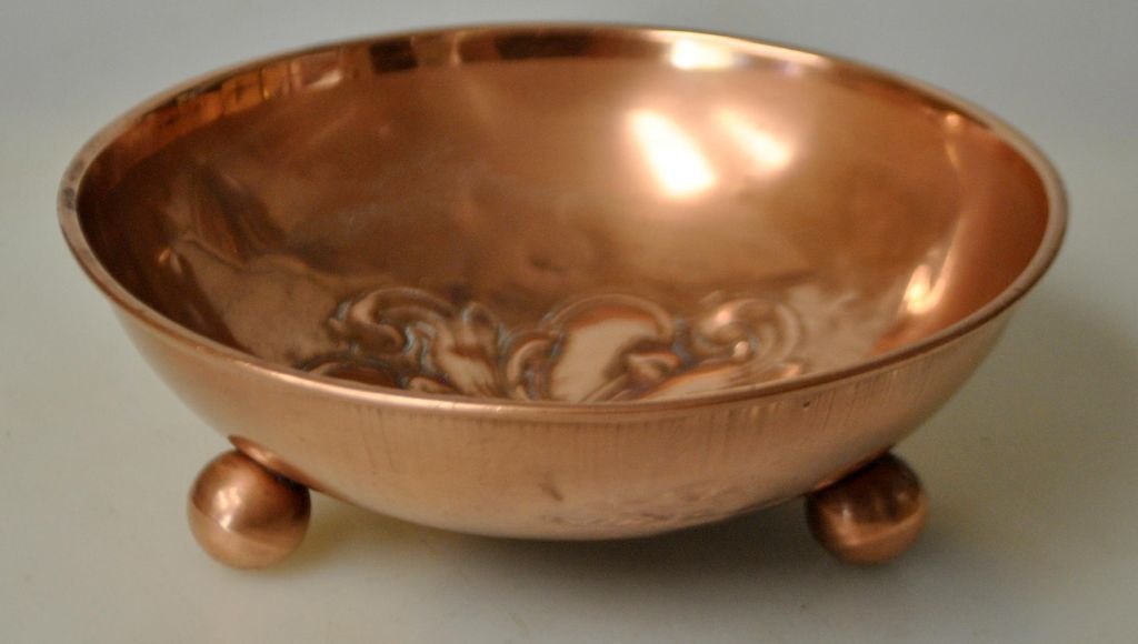Kobber skål, 19. årh. På tre kugleben. Med blomsterudsmykning. H: 4 cm. Dia: 13 cm.