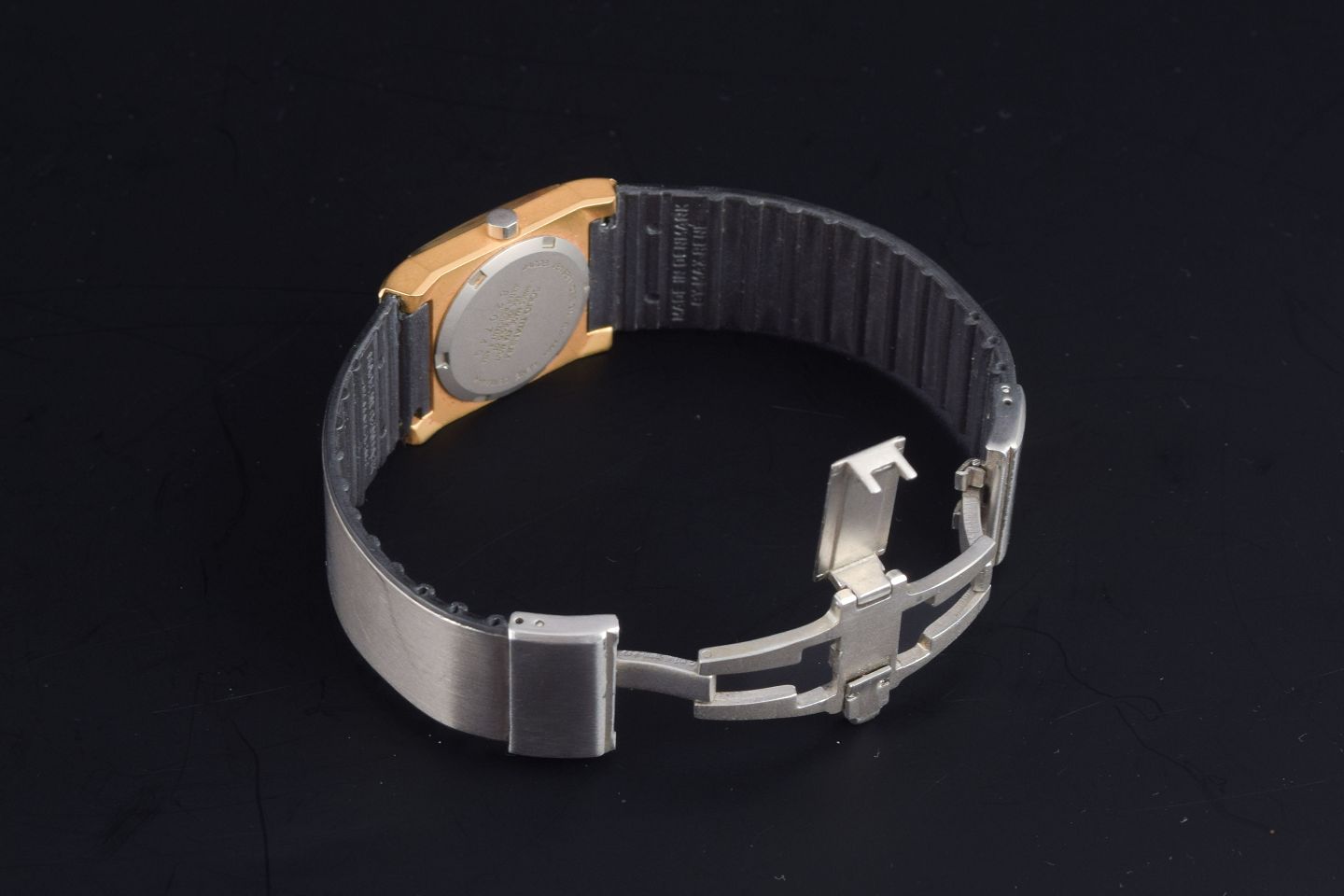 Rektangulært ur med tofarvet urkasse i forgyldt og børstet titanium, minimalistisk urskive i grå og guld, samt originalt integreret armbånd.
