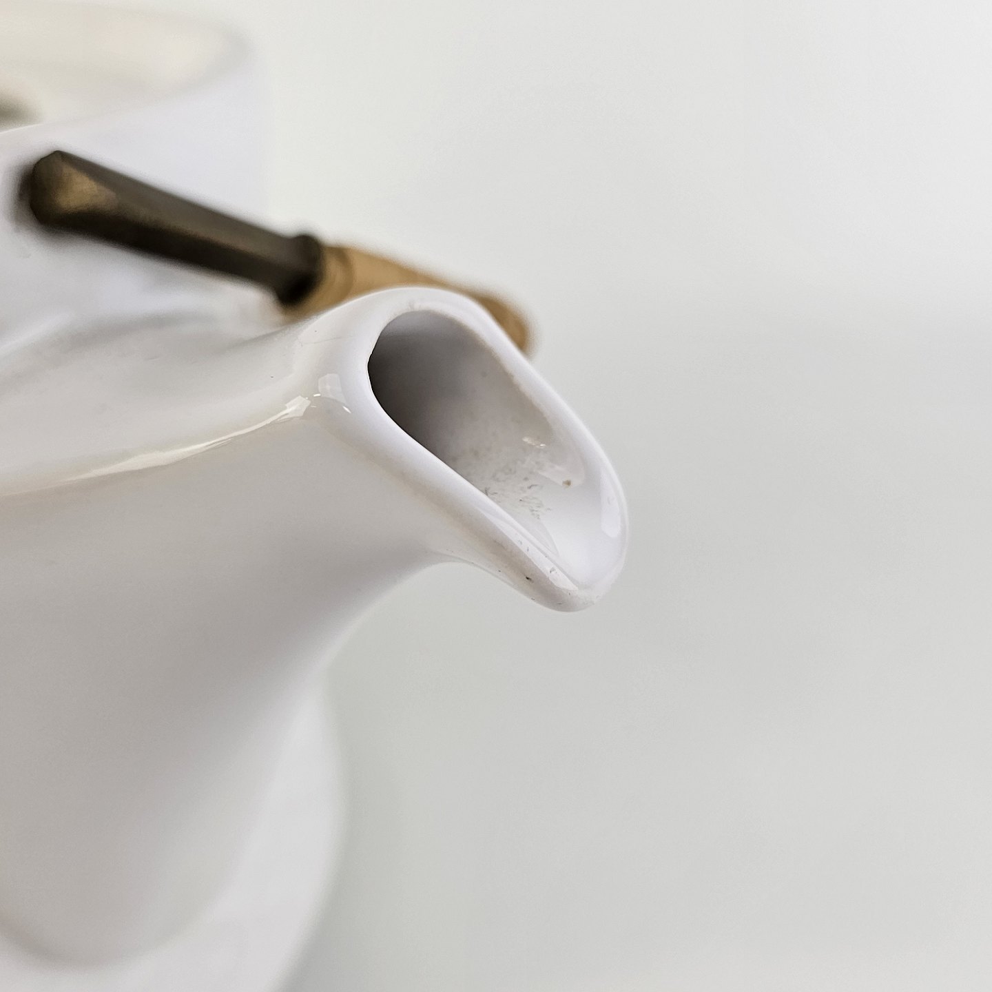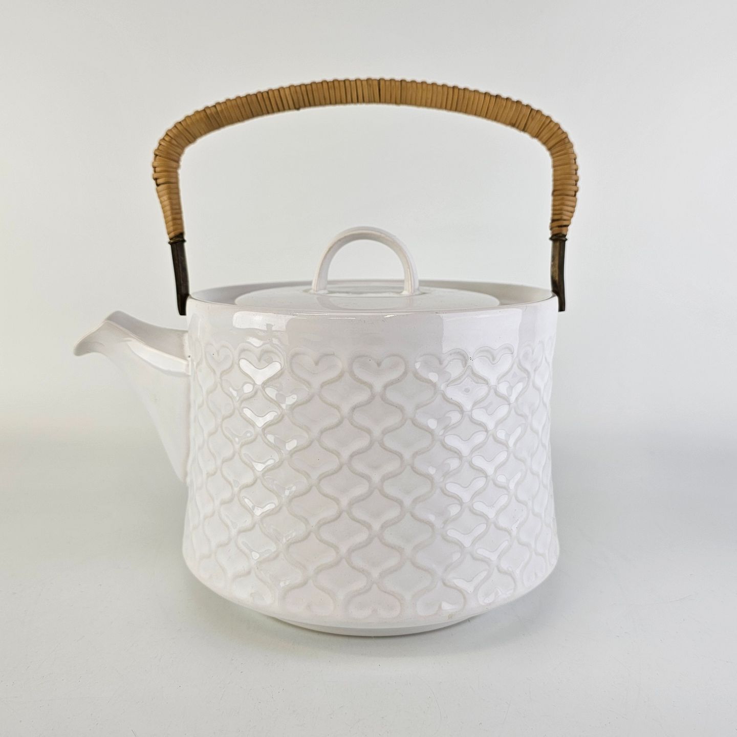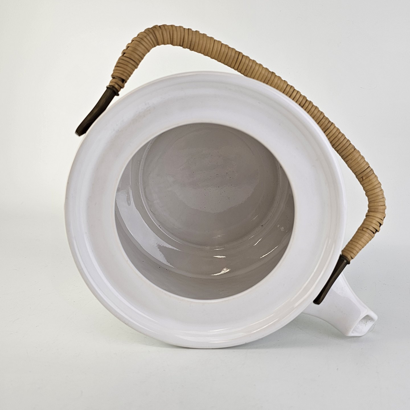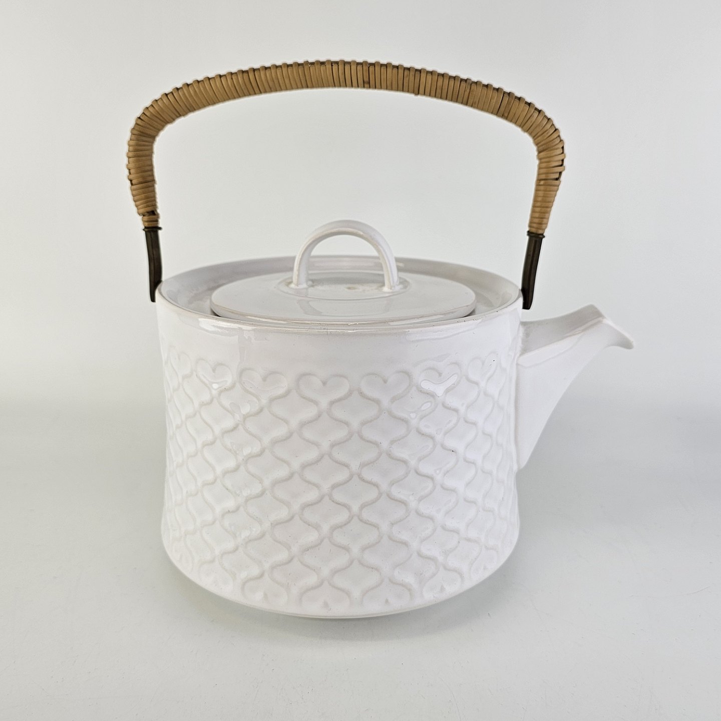 Tekande i stentøj med hank i messing omgivet af naturflet fra stellet Cordial Hvid Palet