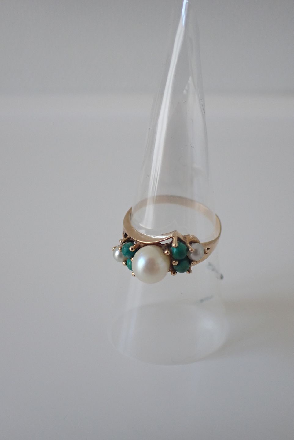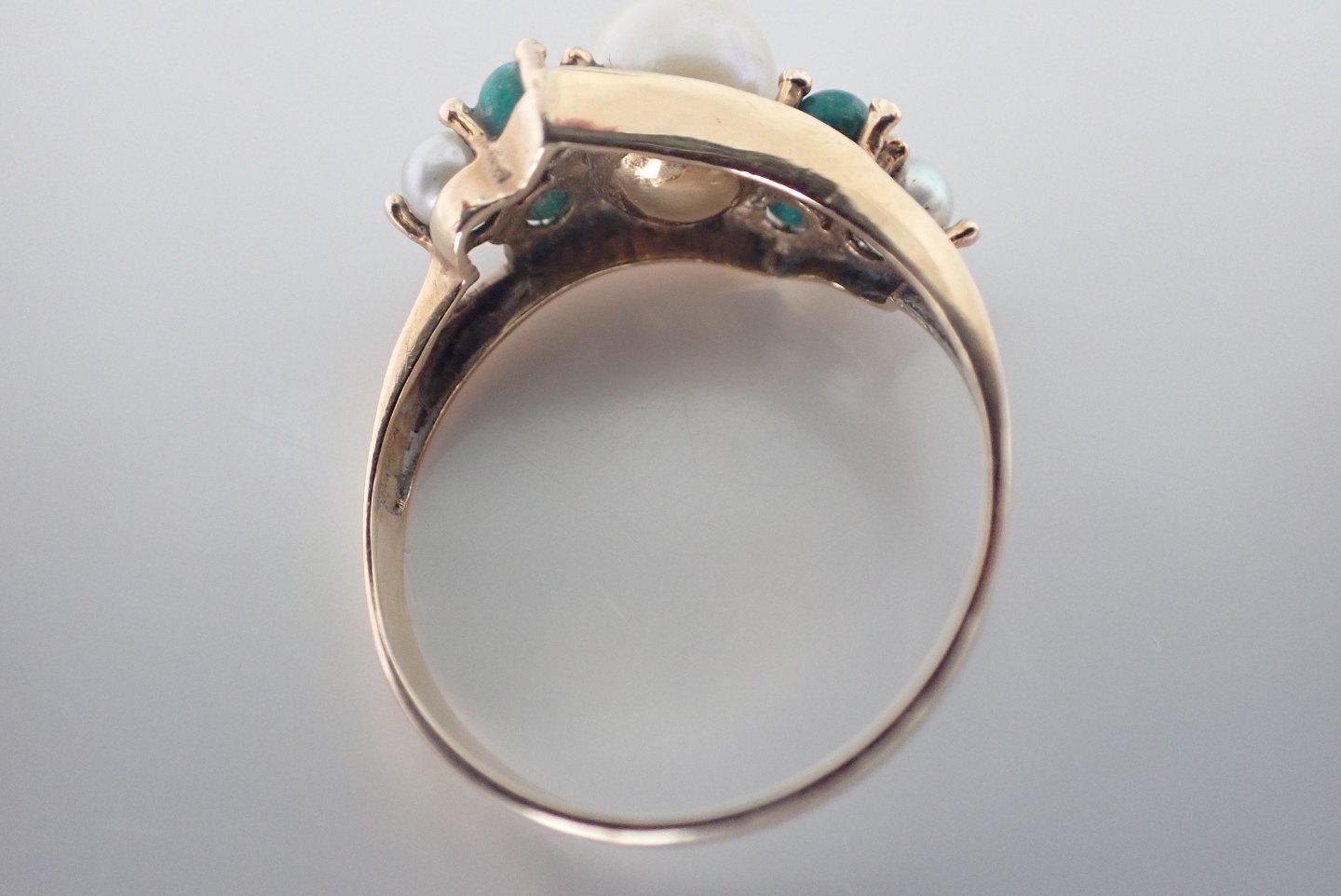 Guldring med 3 kulturperler og 4 små carbochonslebne turkiser. Ringen er udvidet og stemplet er tabt; men testet til 14 karat. Ca. 1950. Str.:57. Bredde ved perler: 0,8 cm. Ringskinne bag: 0,2 cm. I pæn stand med tidstypisk slid, turkiser grønlige.
