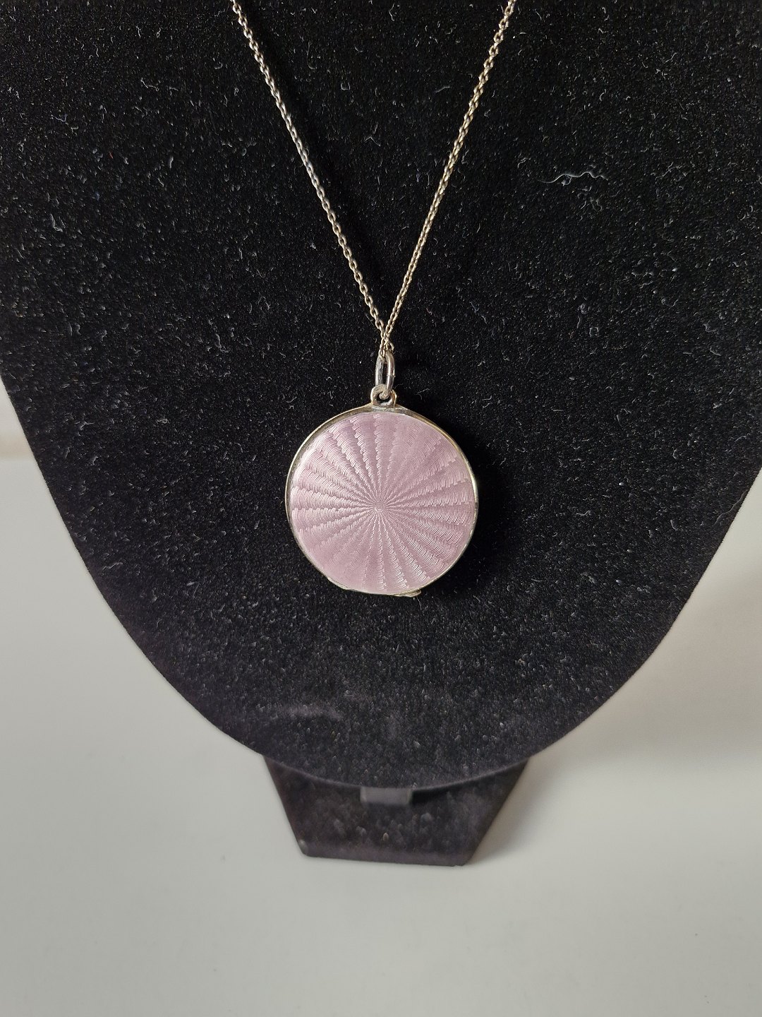 Smuk svensk medaljon med kæde i forgyldt sølv og lyslilla/lyserød emalje dekoreret med kirsebærblomster