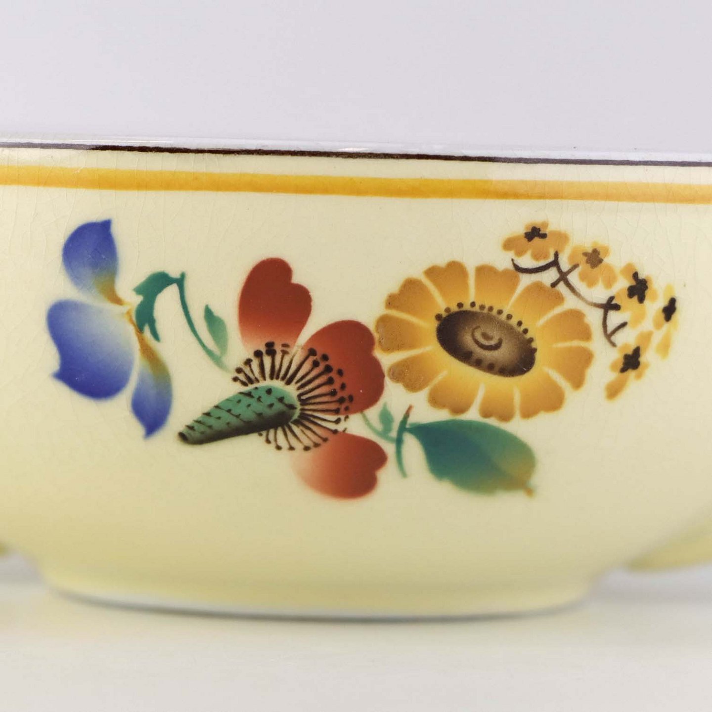 Stel i glat gul fajance med dekoration af farverige og forskelligartede blomster samt med gul og sort kantstreg.
