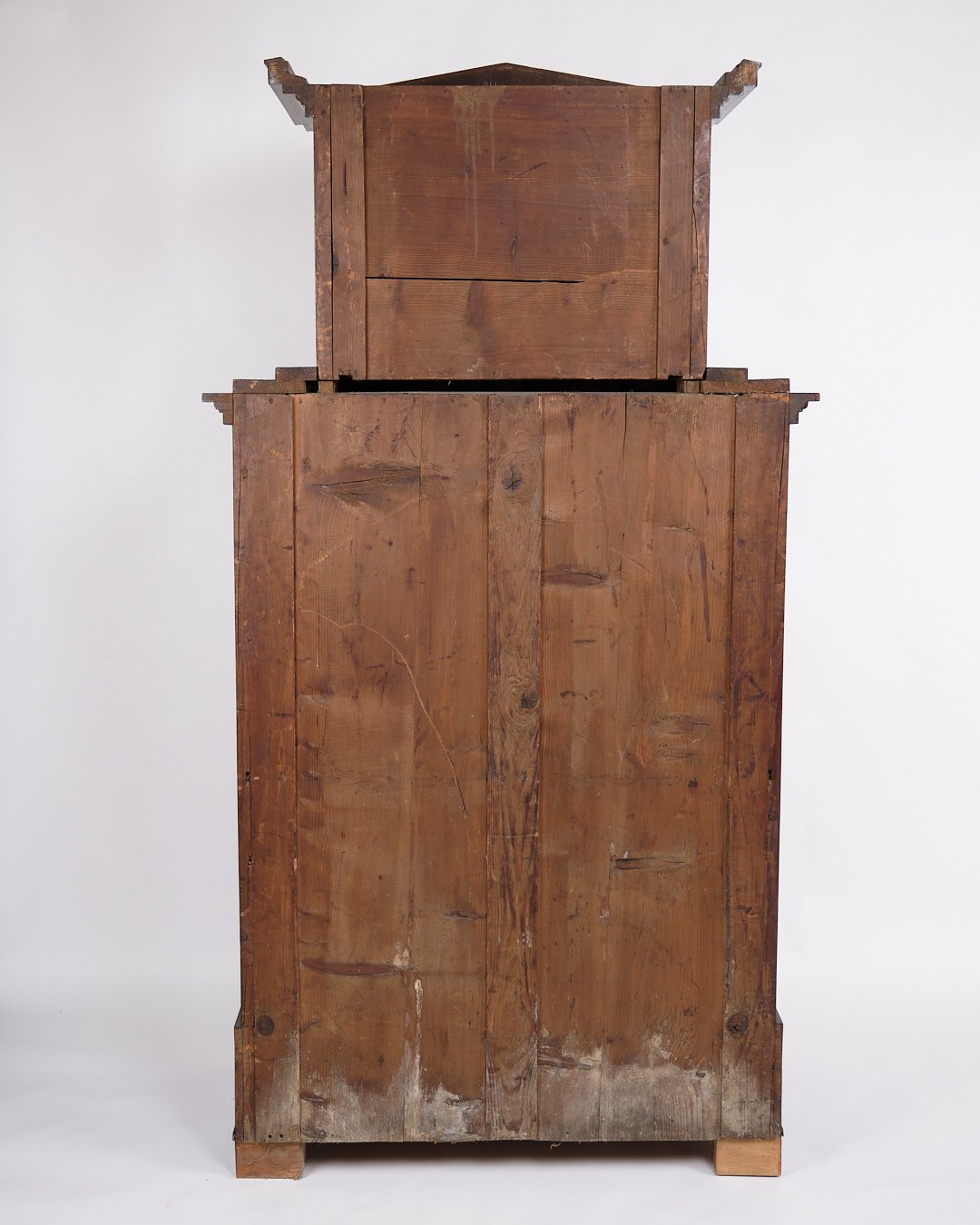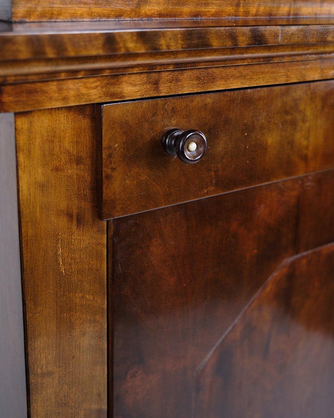 antik sekretær fra 1840’erne, udført i håndpoleret birketræ med smukke intarsia-detaljer. Møblet er indrettet med to skuffer og fremstår som et fint eksempel på 1800-tallets klassiske snedkerhåndværk, hvor funktionalitet og dekorativt udtryk blev forenet.
