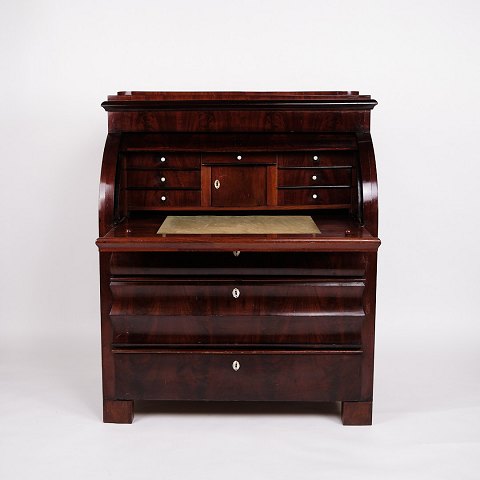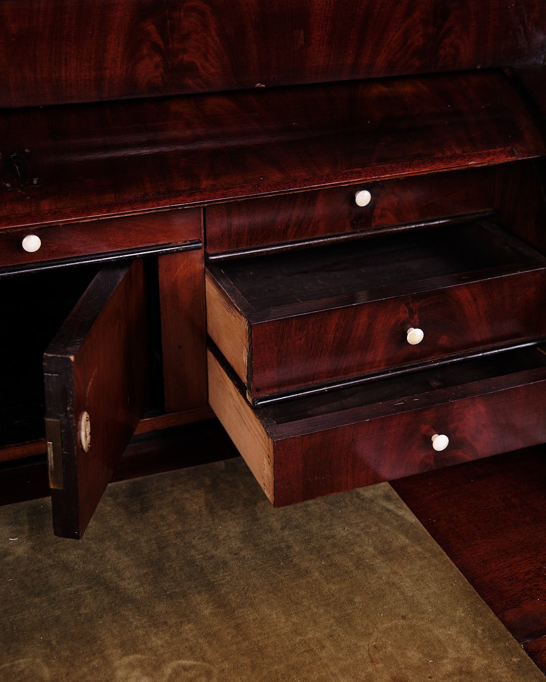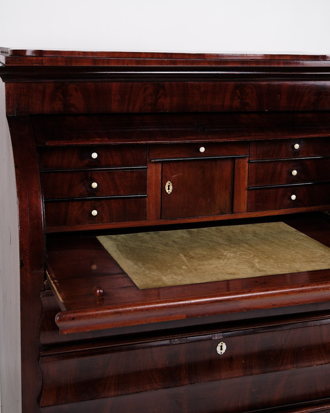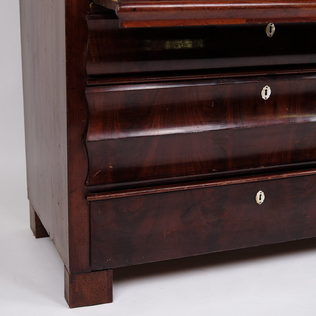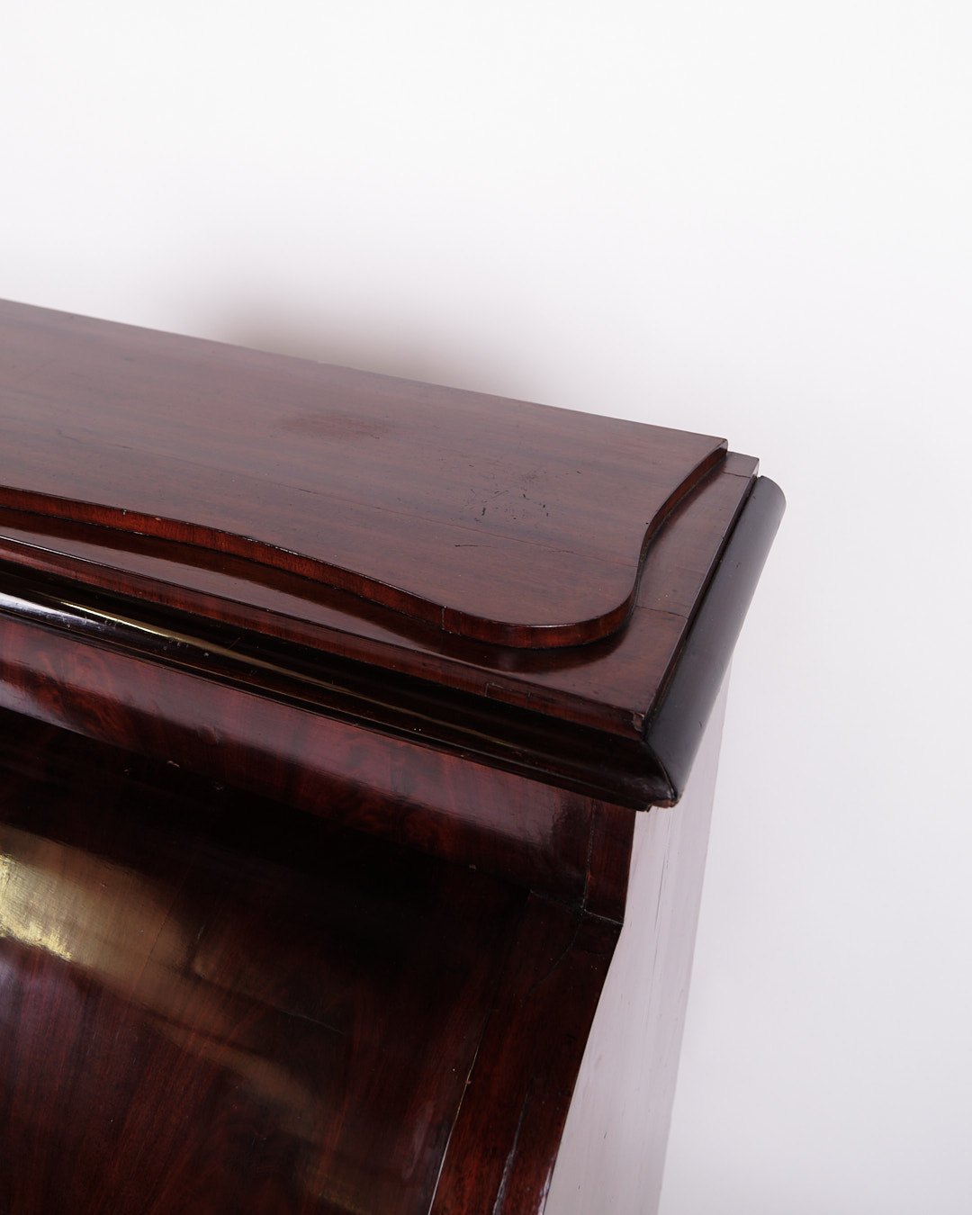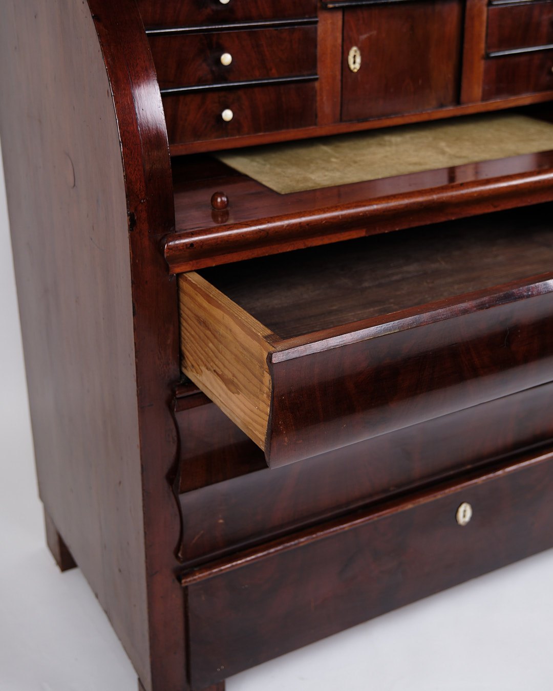 — Materiale: Håndpoleret mahogni med perlemorsbeslag og benknopper