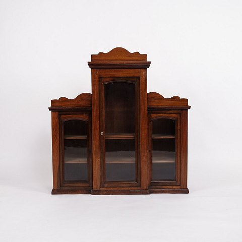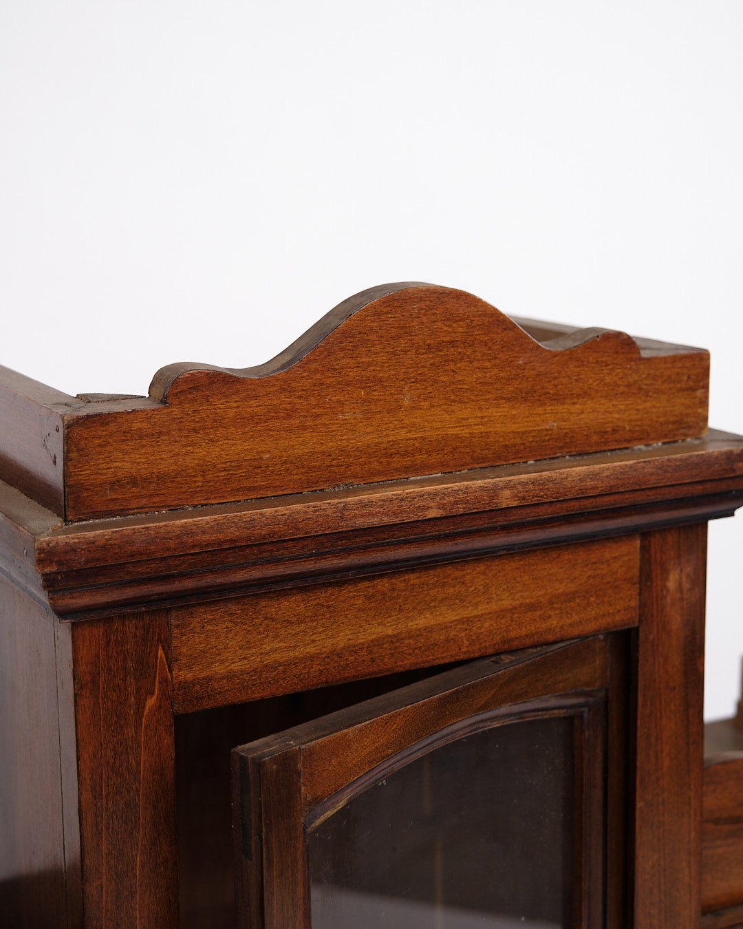 væghængt vitrineskab fra 1890’erne, udført i håndpoleret mahogni. Skabet har klassiske proportioner og fremstår med et tidstypisk design fra slutningen af 1800-tallet, hvor funktionalitet og dekorativt udtryk gik hånd i hånd.