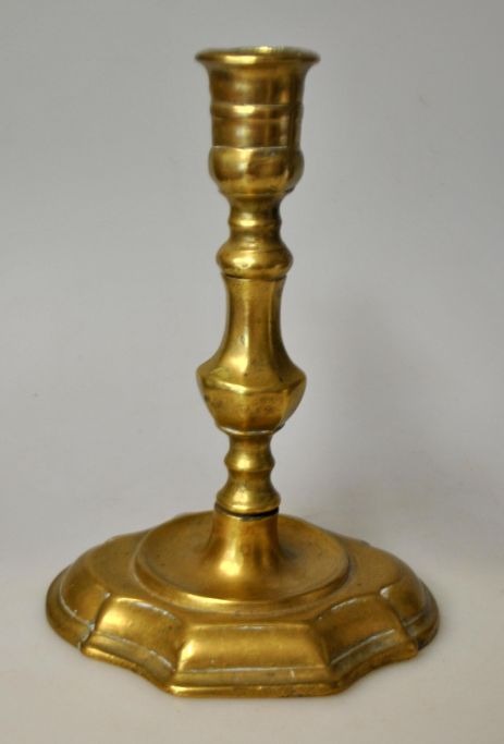 Dansk barok messing lysestage, 18. årh. Profileret stamme og fliset 8 kantet aflang fod. H.: 16,5 cm.