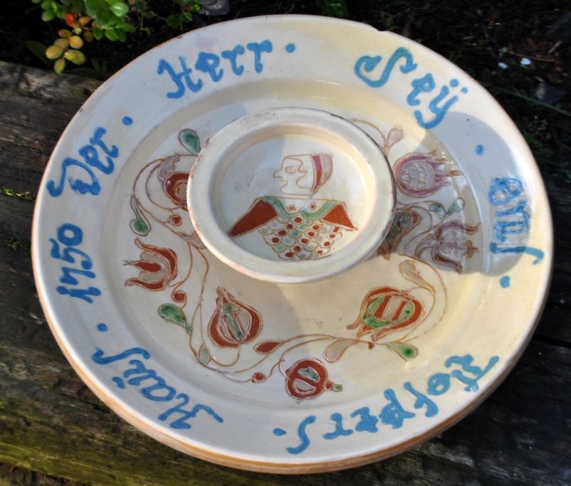 Nordtysk dobbelt fad, 20. årh. Lertøj med glasur og tekst. Kopi af ældre fad fra 1750. Signeret. H.: 7 cm. Dia.: 34 cm.