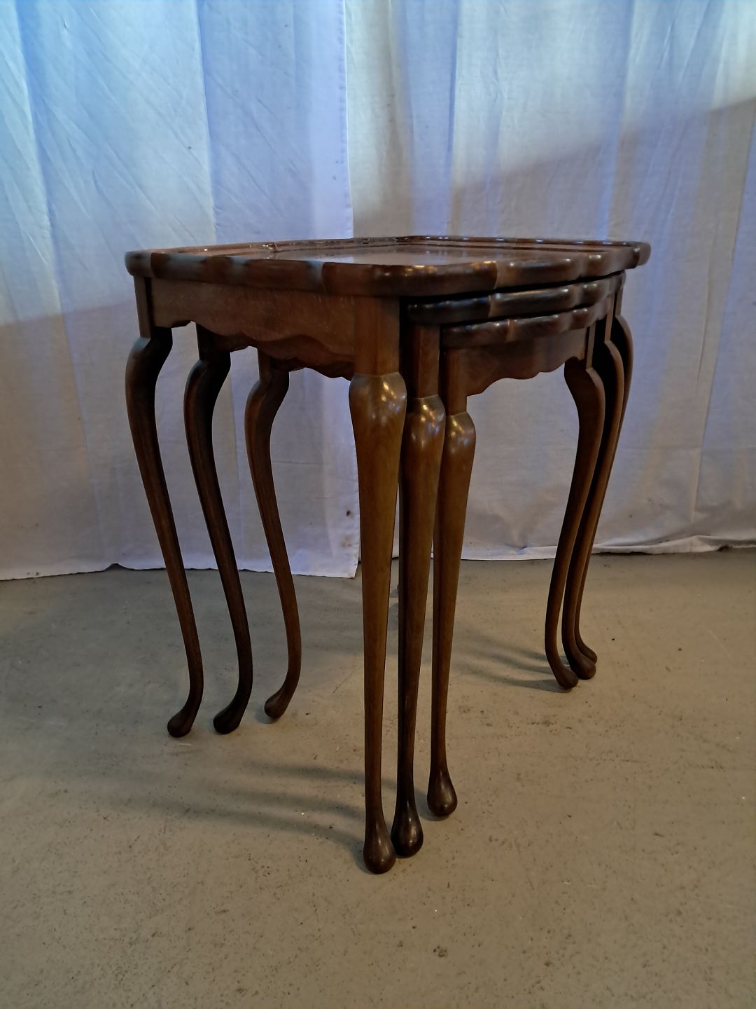 3 Indskudsborde i massivt bøgetræ og fineret nøde og rosentræ, fra 1980erne.