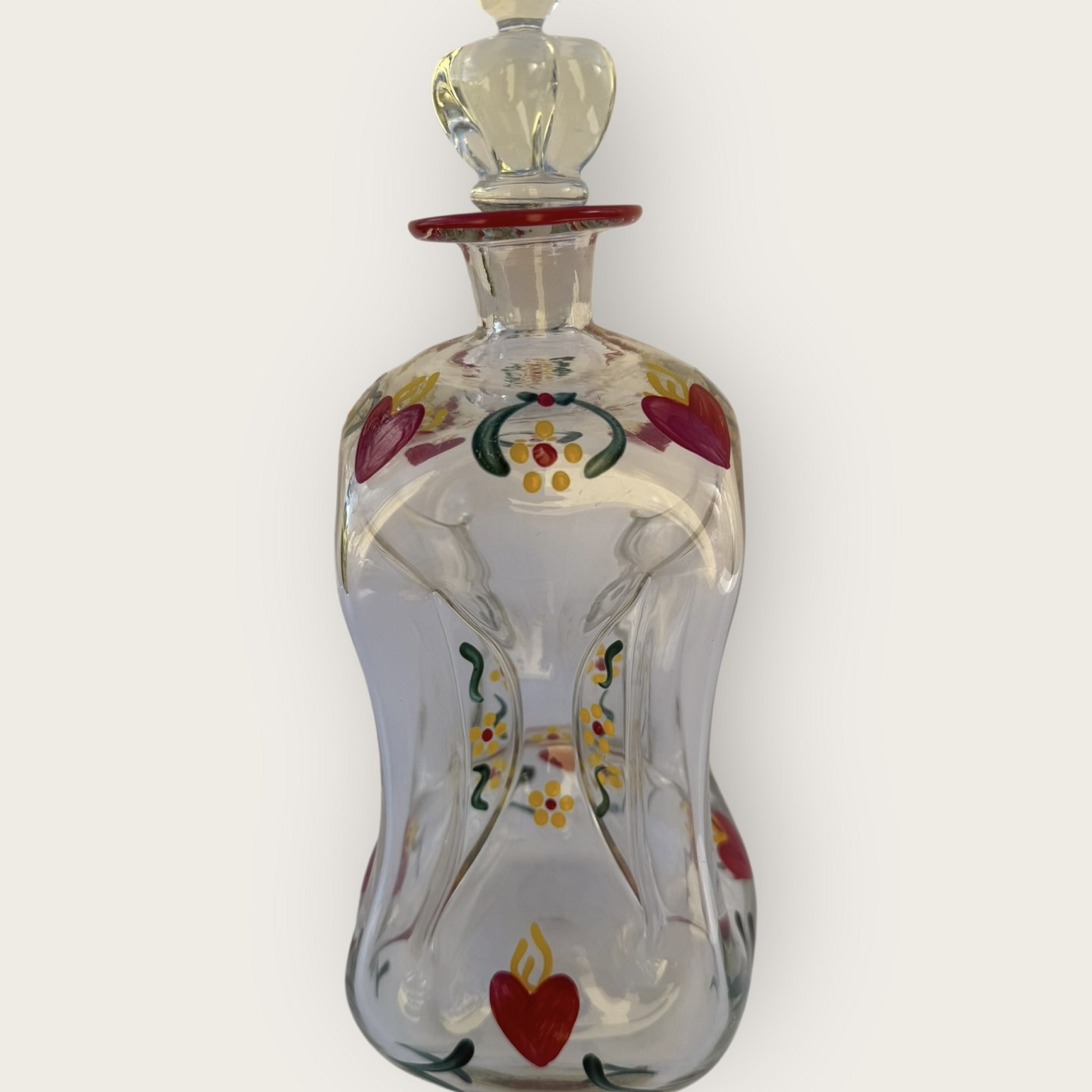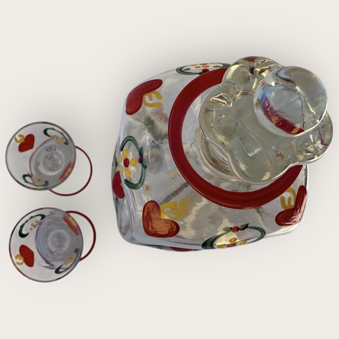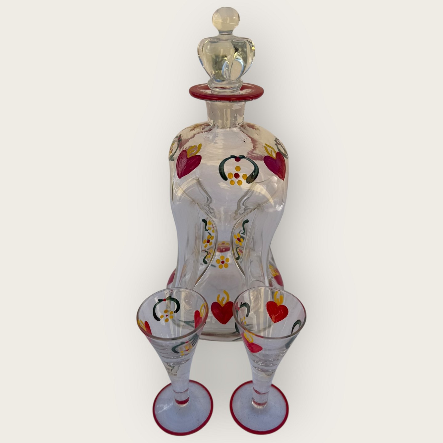 Holmegaard, Bemalet klukflaske med kroneprop og 2 glas, udsmykket med røde hjerter m.v.; Højde 25cm, højde snapseglas 10cm