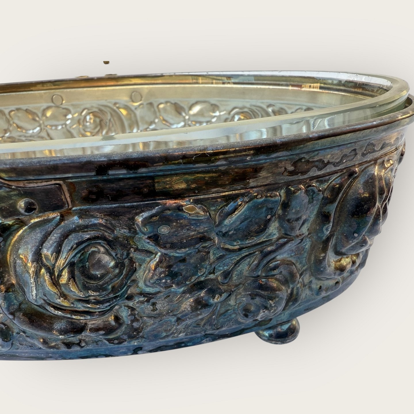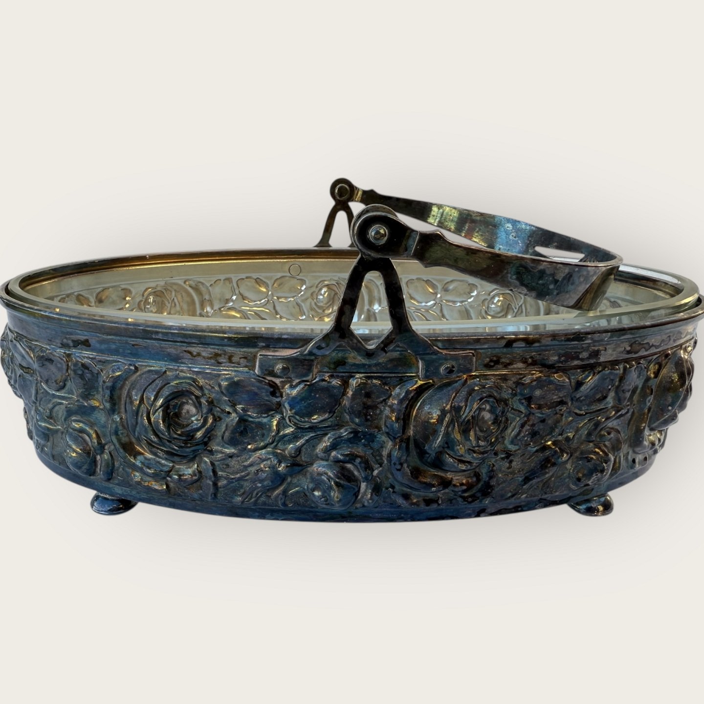 Skål med glasindsats i sølvplet med udsmykning af roser og med hank, 25x14cm. *Flot patineret stand, med hel glasskål*