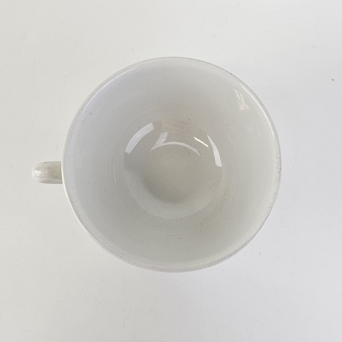 Stel i glat hvid fajance med dekoration af blå blomster og flettet kant