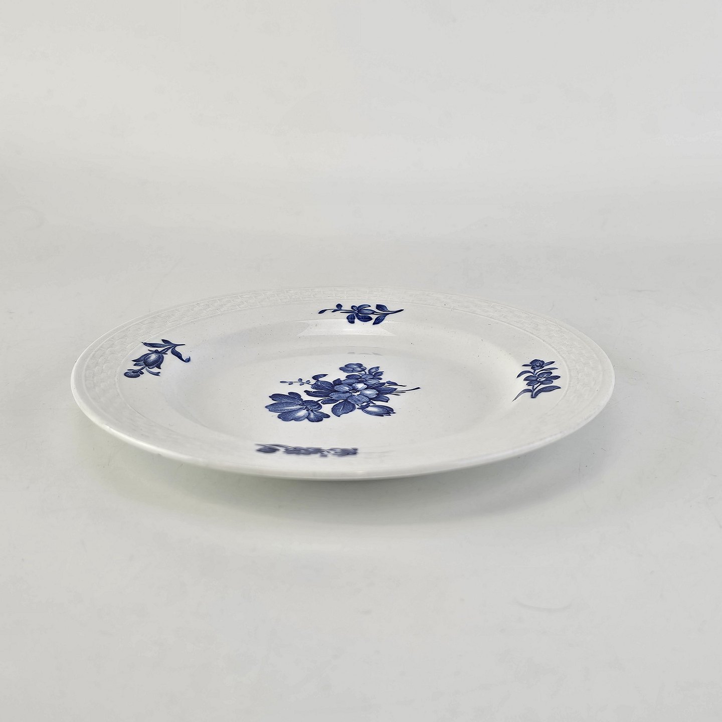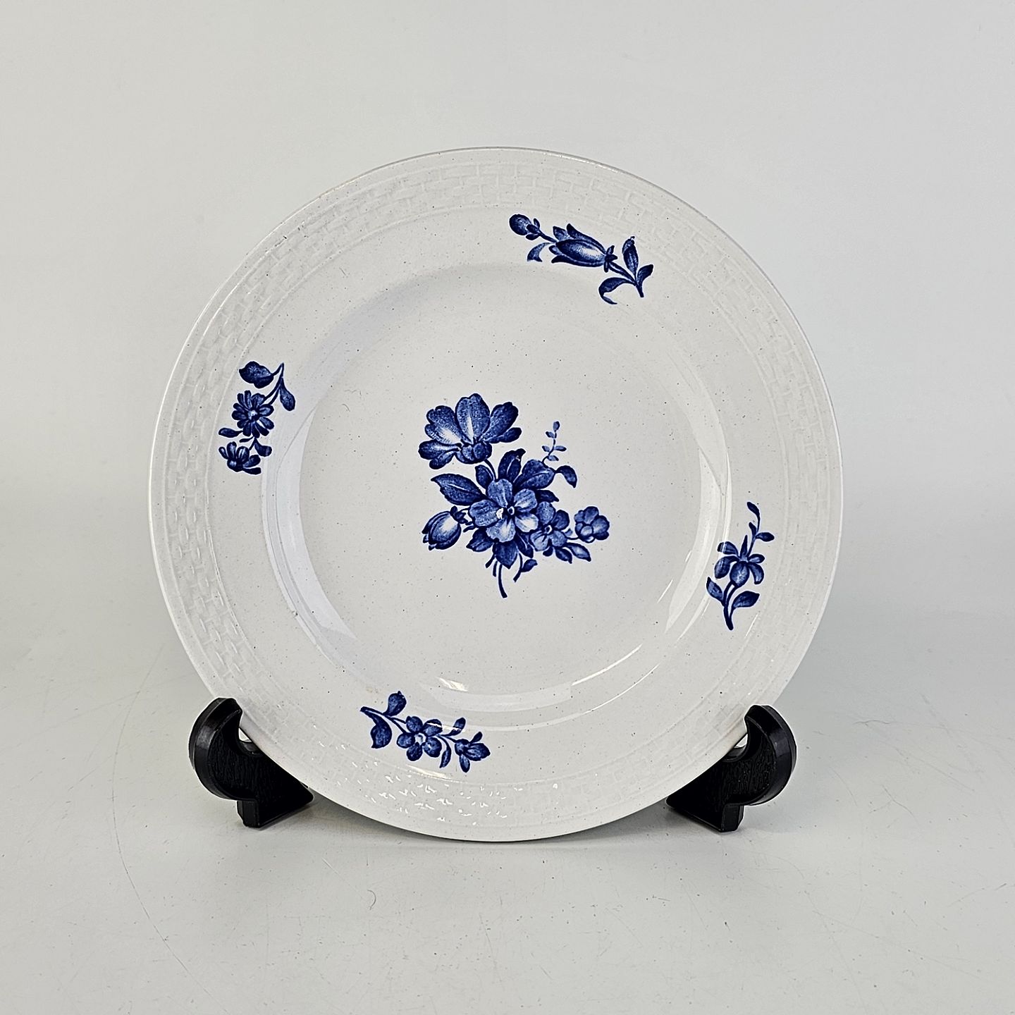 Stel i glat hvid fajance med dekoration af blå blomster og flettet kant