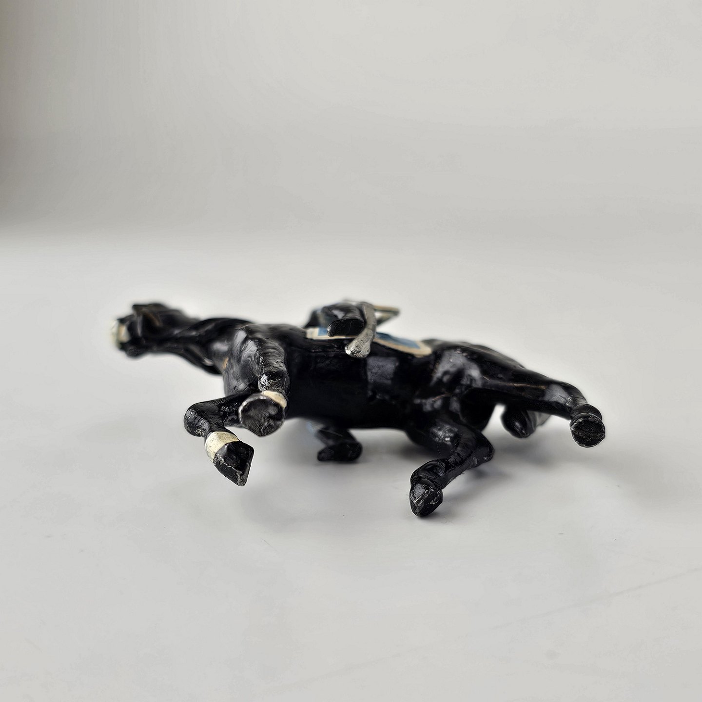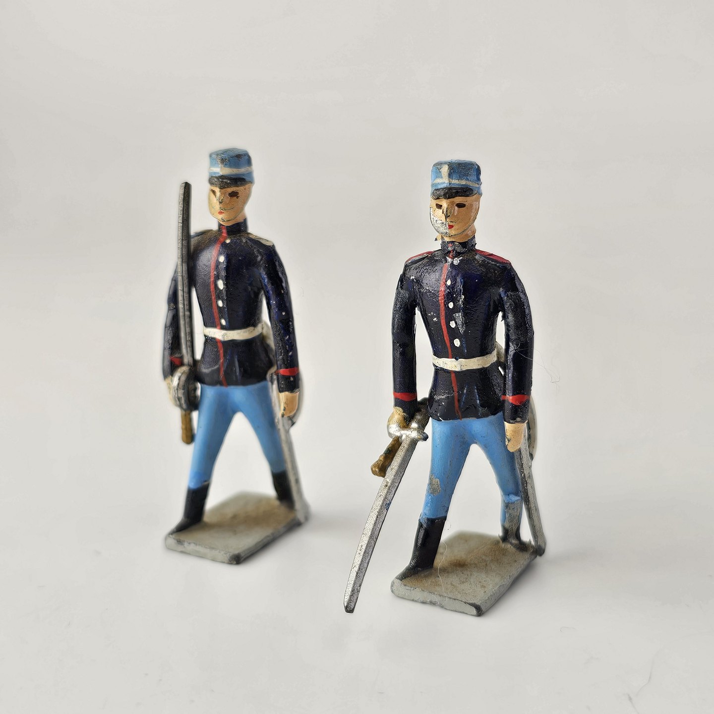 Fem figurer af soldater i tin, én til hest og 15 fodfolk med trommer eller våben