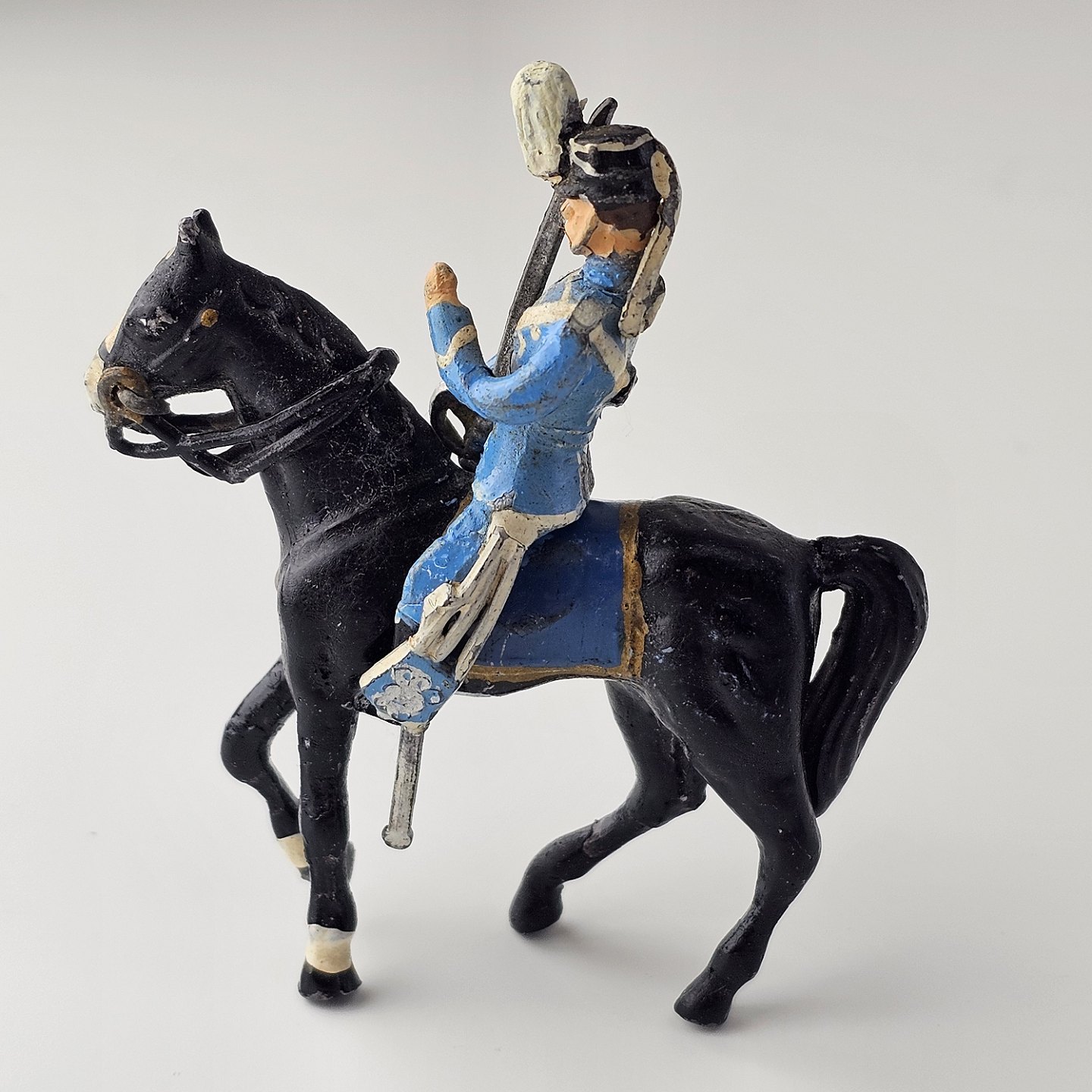 13 figurer af dragoner på heste i tin. Seks brune heste og syv sorte heste, to dragoner rider med flag og ni med sabler, og en løs fane