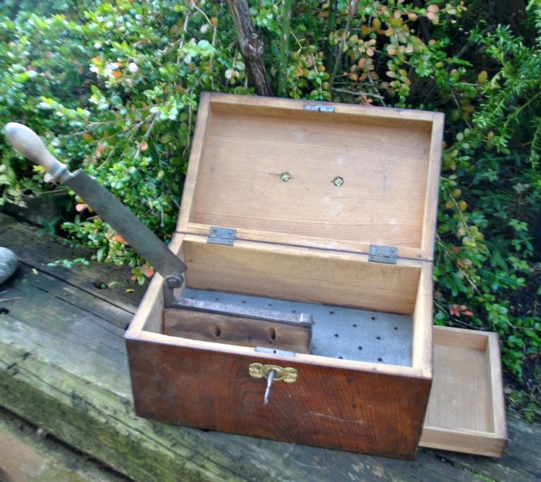 Sukkerkasse i poleret elmetræ, 19. årh. Med huggekniv, perforeret bund og skuffe. Inkl. lås med nøgle og messinghåndtag. H: 19 cm. B: 36,5 cm. D: 22 cm.