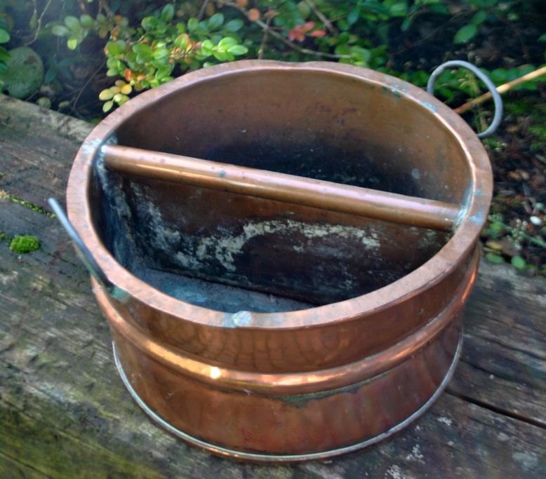 Lim potte i kobber, 19. årh. I to dele. Overdel med to rum. Underdel med to hanke. H: 13,5 cm. Dia: 25 cm.