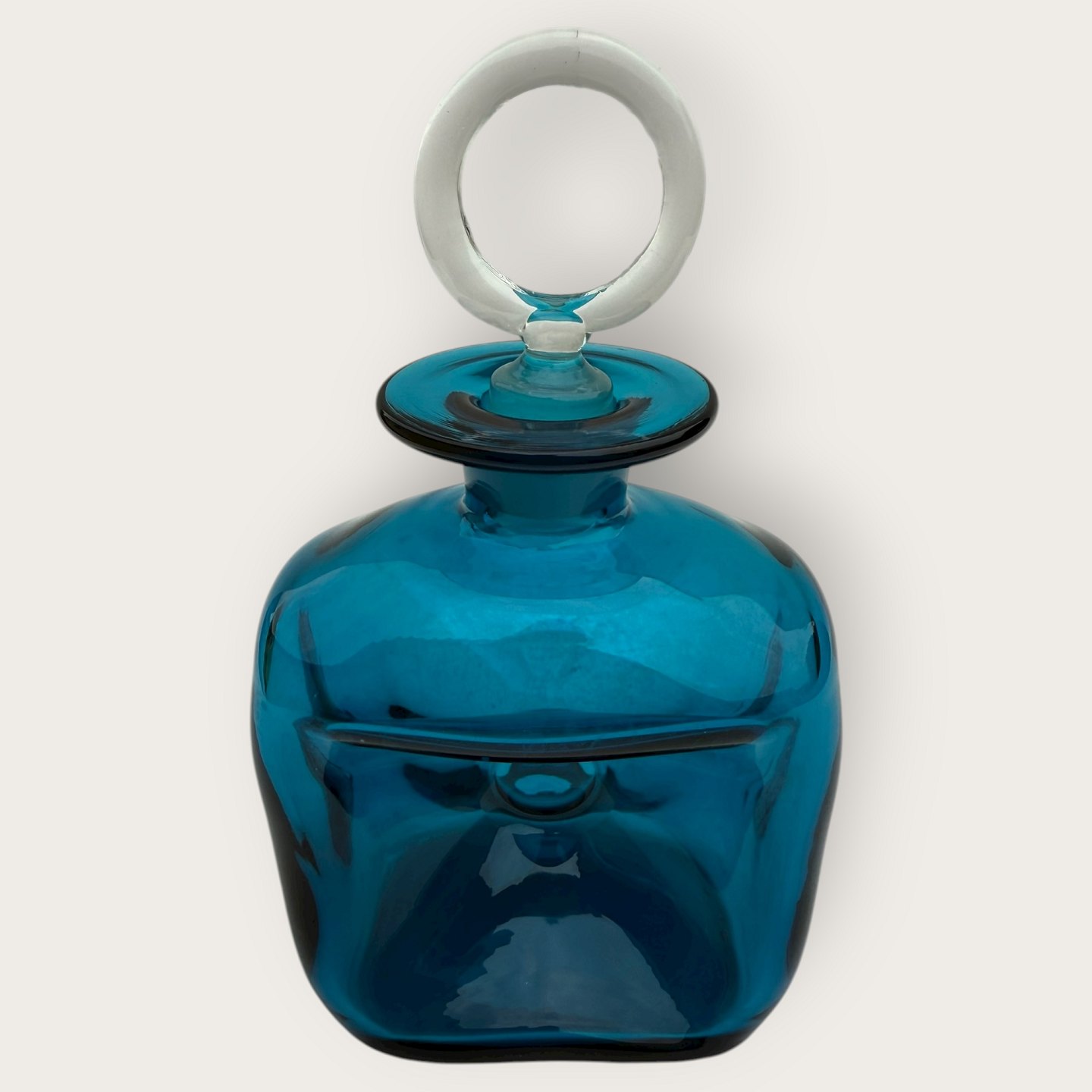 Kastrup Glasværk, Blå klukflaske med flad klar prop, 19x11x7cm *pæn brugt stand*