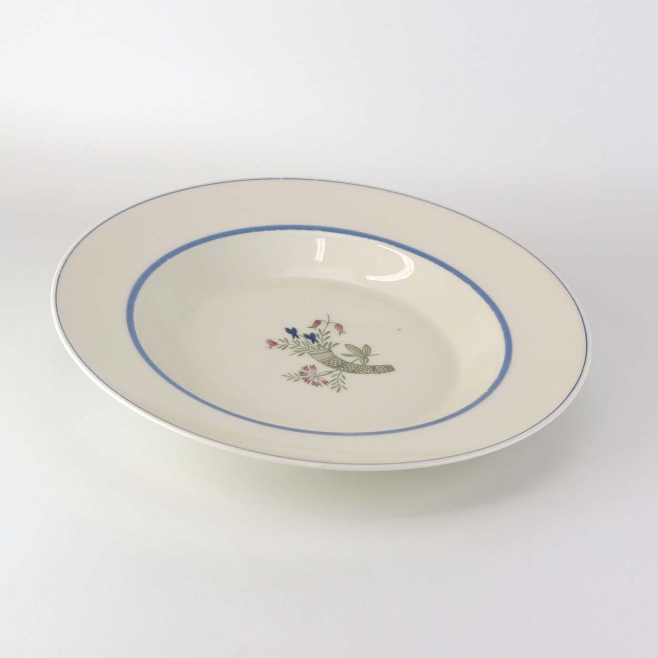 Service i glat lyst porcelæn med blå kantstreg og dekoration med horn samt blå og røde blomster.