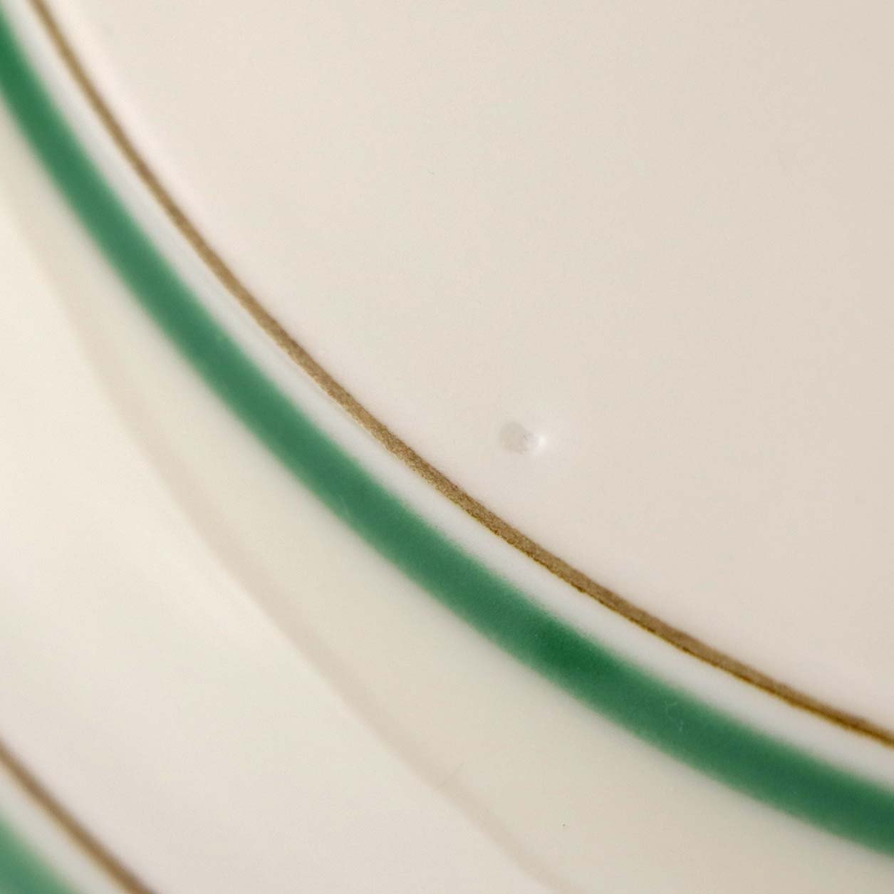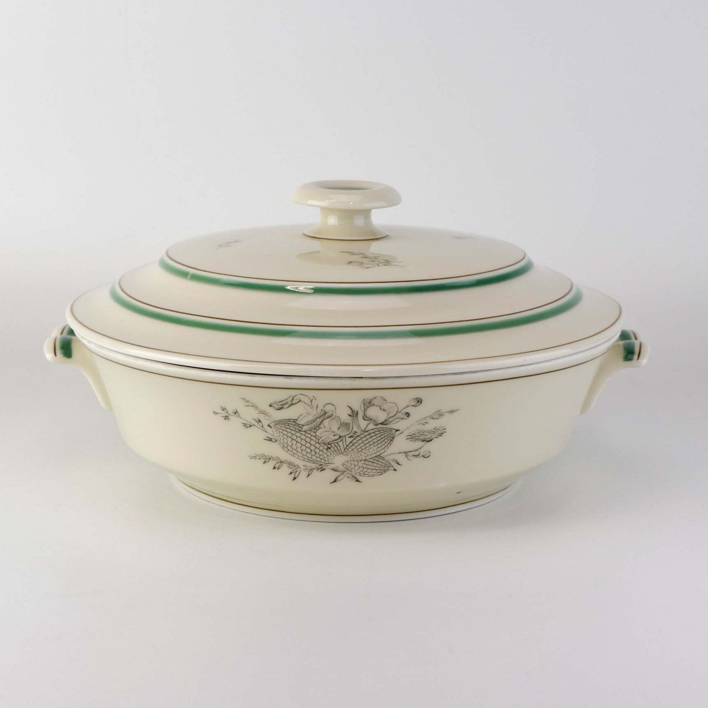 Fremstår med mindre ujævnhed i porcelæn på låget, brugsspor på skålens topkanten samt brun plet under glasuren under bunden af lågfadet.