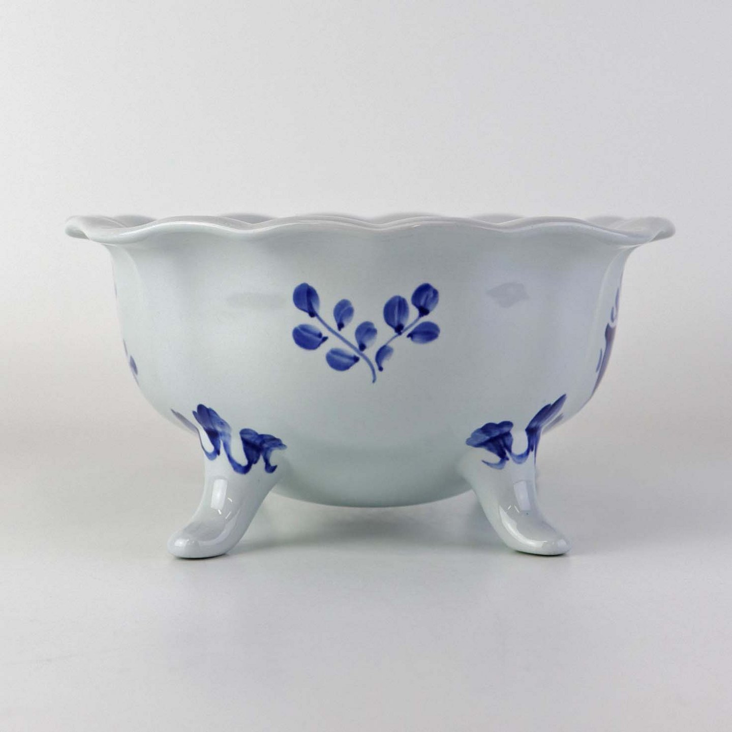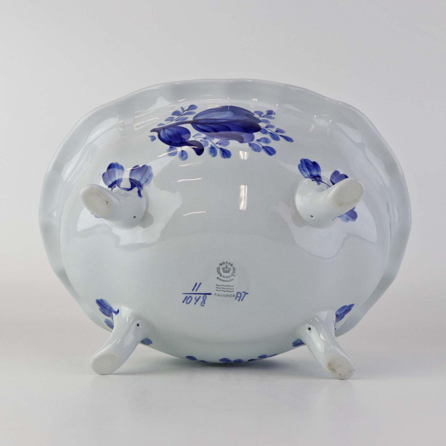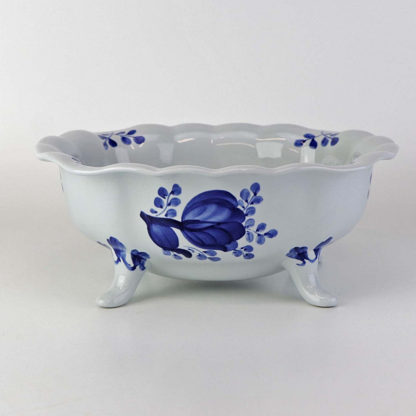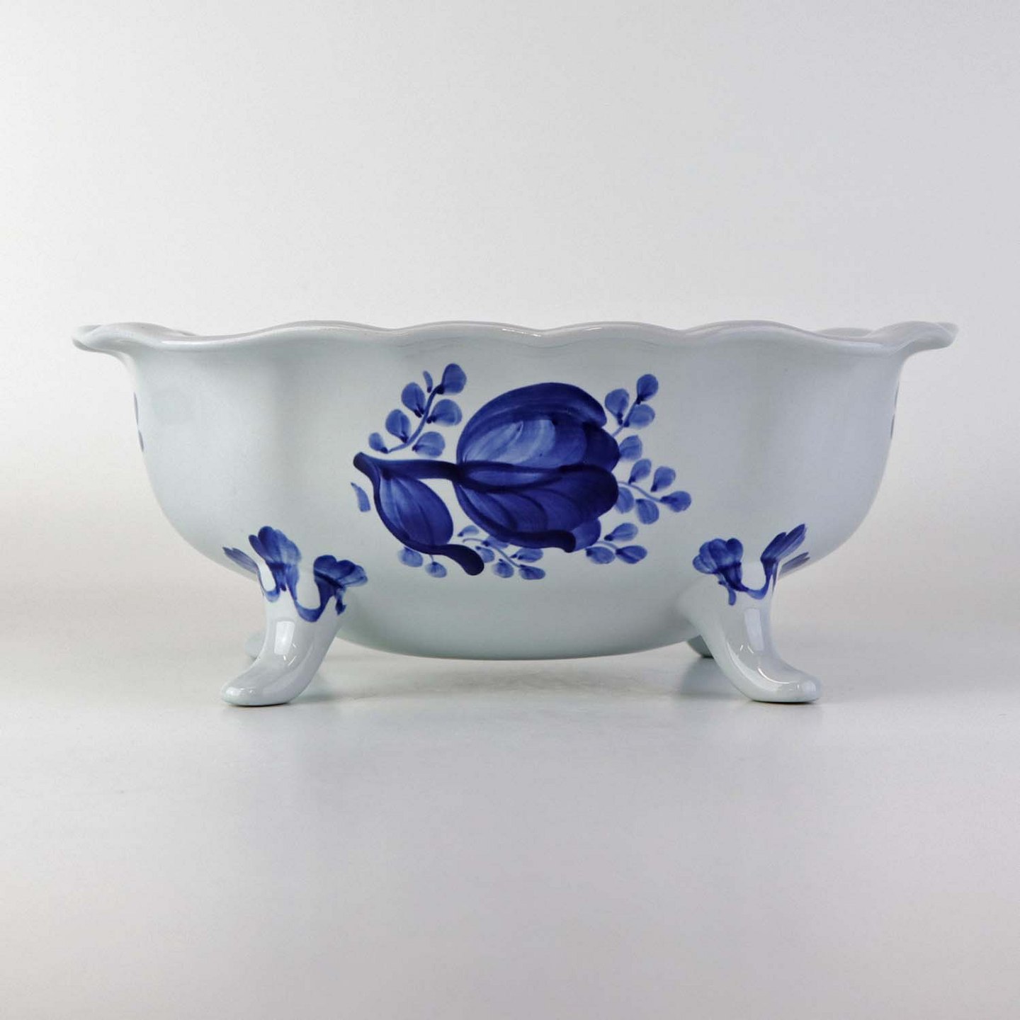Skål på fire fødder i fajance fra stellet Blå Tranquebar. Nr. 11/1048