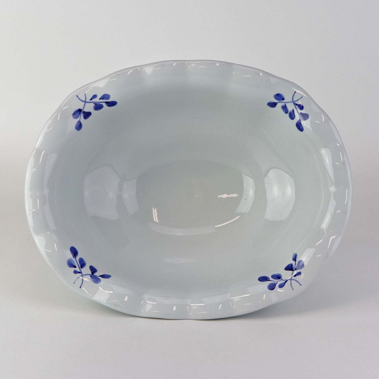 Glat Lyst fajance med blå dekoration af blomster og blå bort.