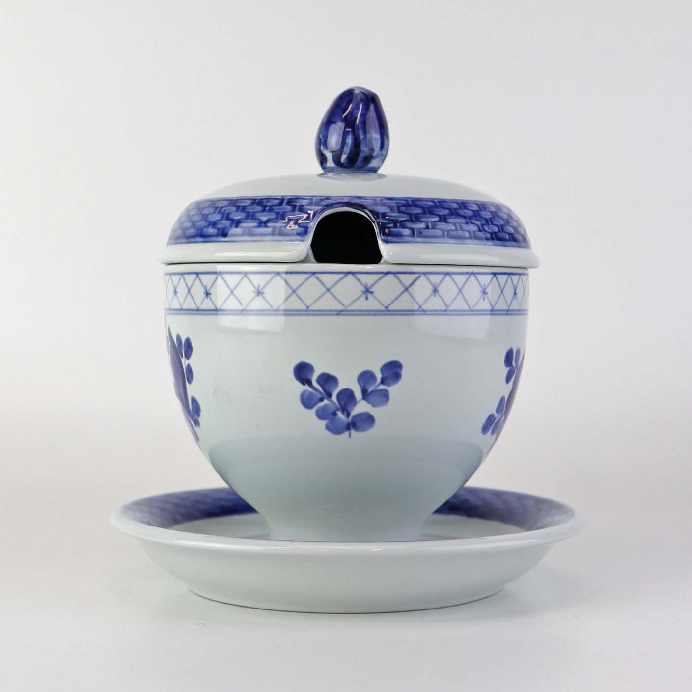 Glat Lyst fajance med blå dekoration af blomster og blå bort.