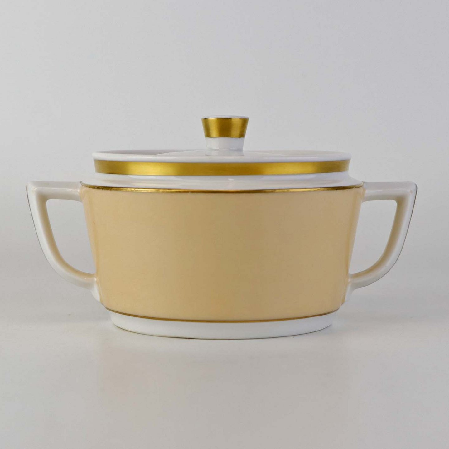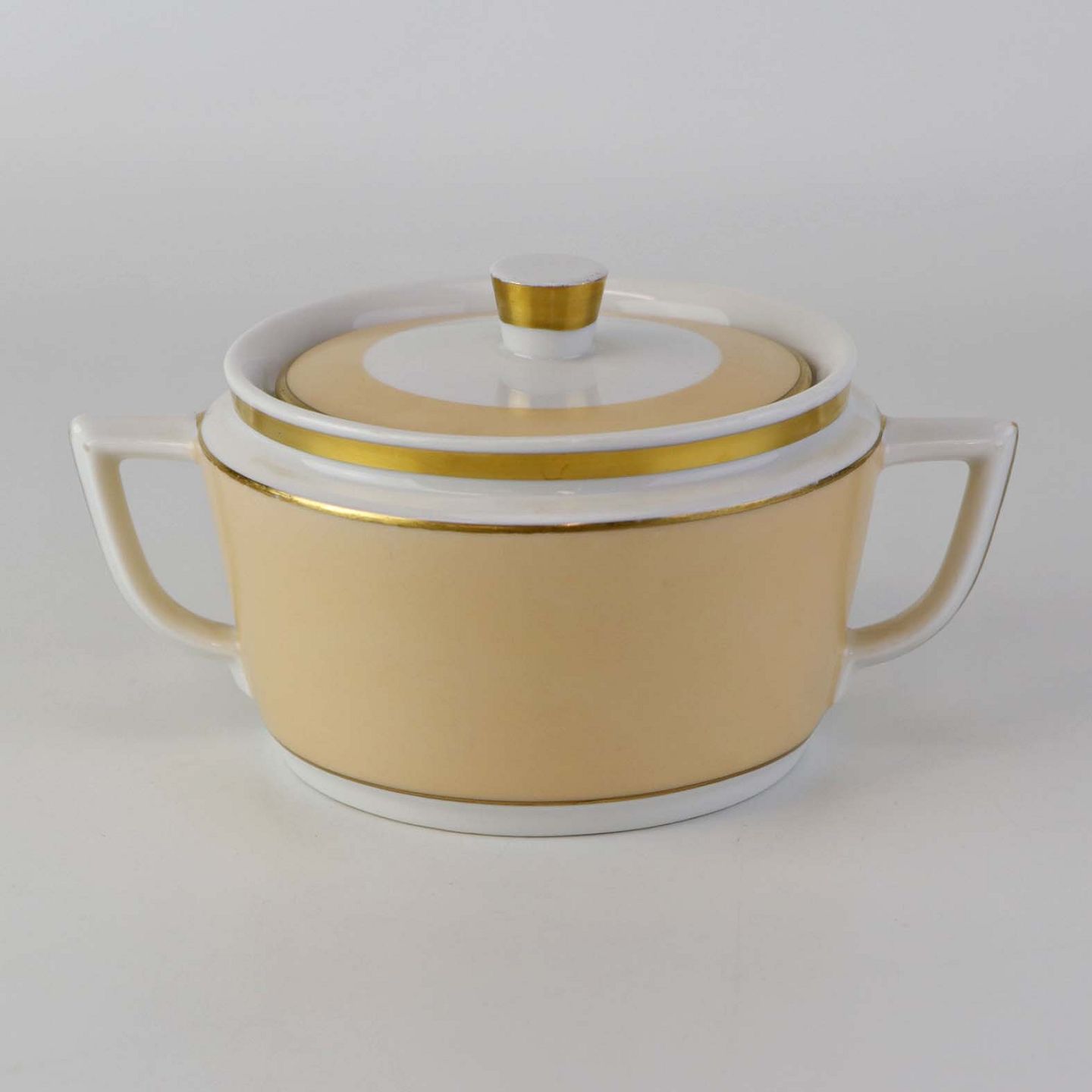 Service i glat hvid porcelæn med sandfarvet dekoration og gylden kant.