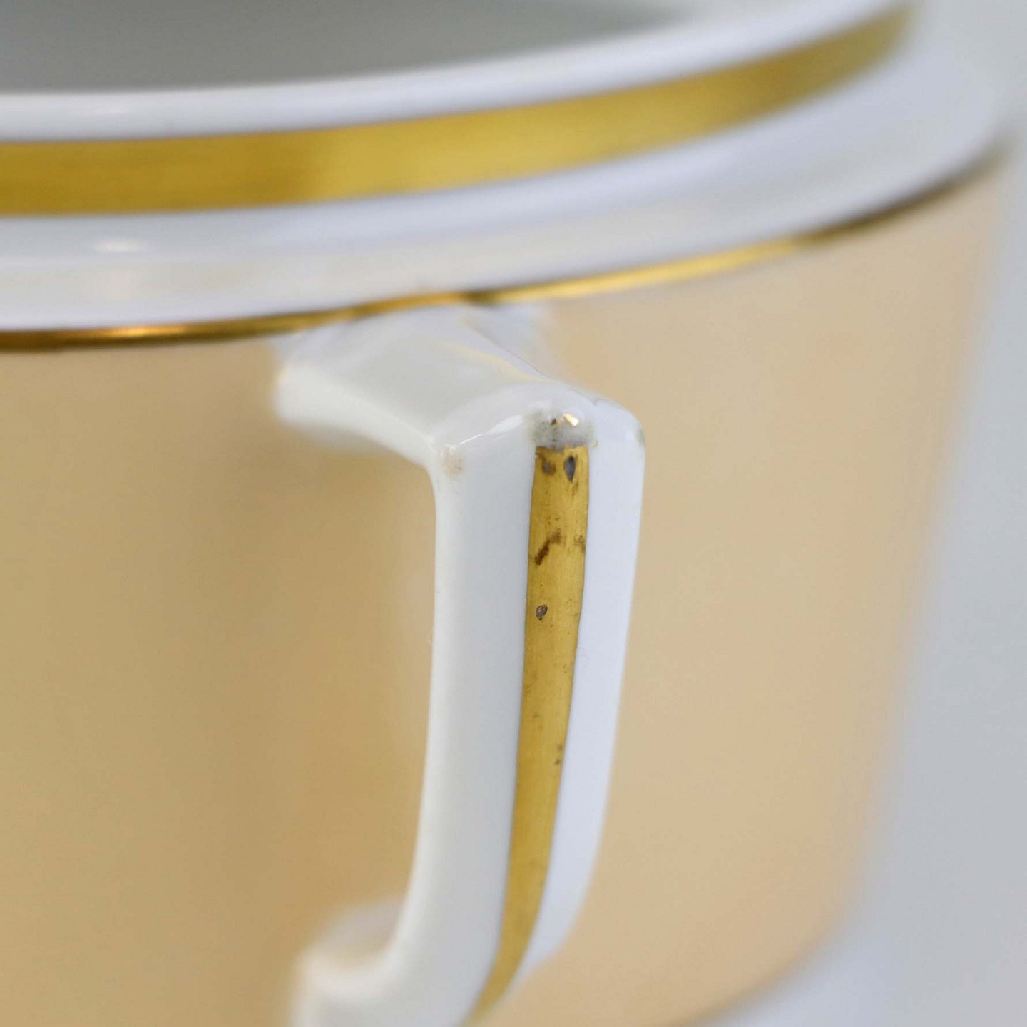 Fremstår med mindre brunet plet under glasuren på indvendig side og brugsspor på hankens guldkant.