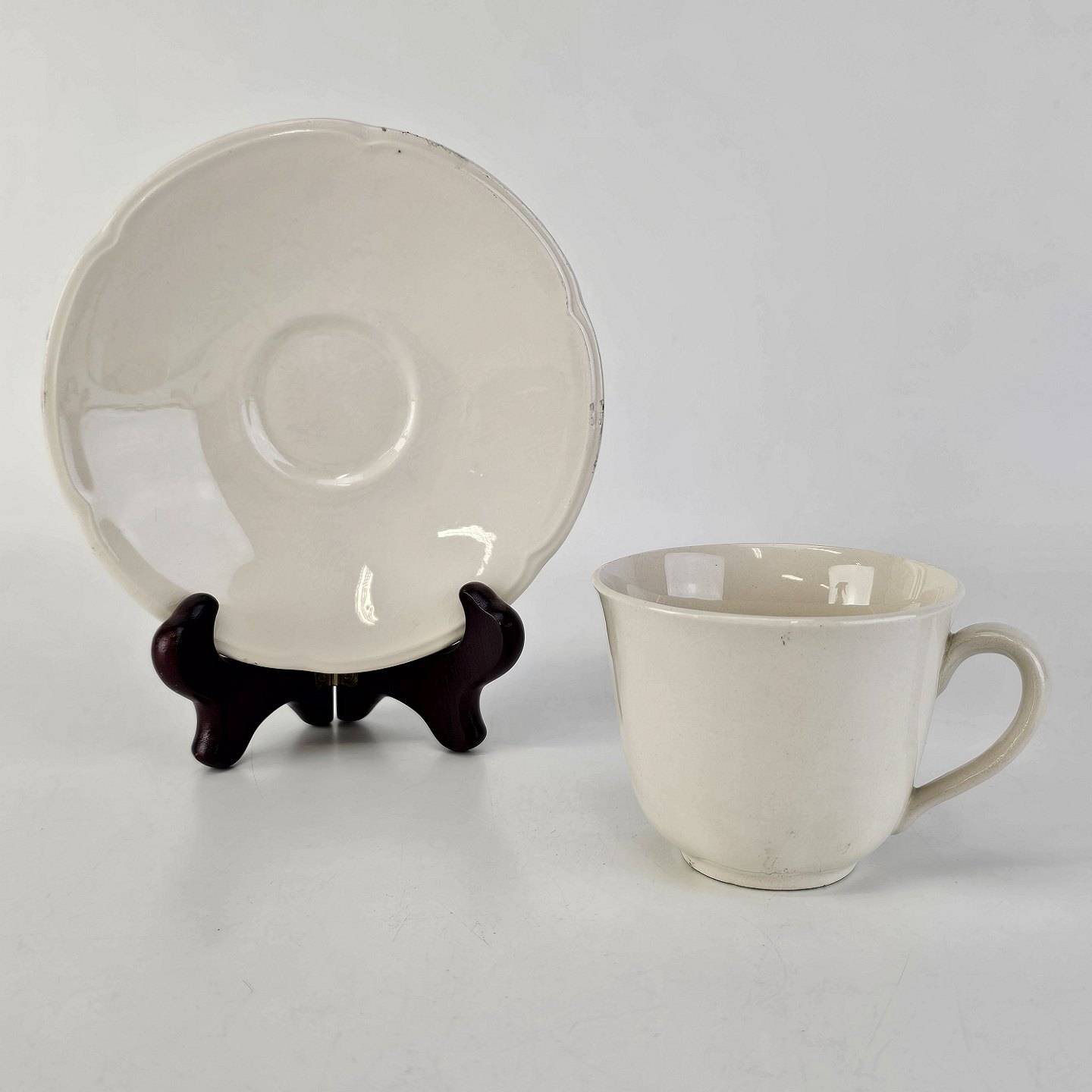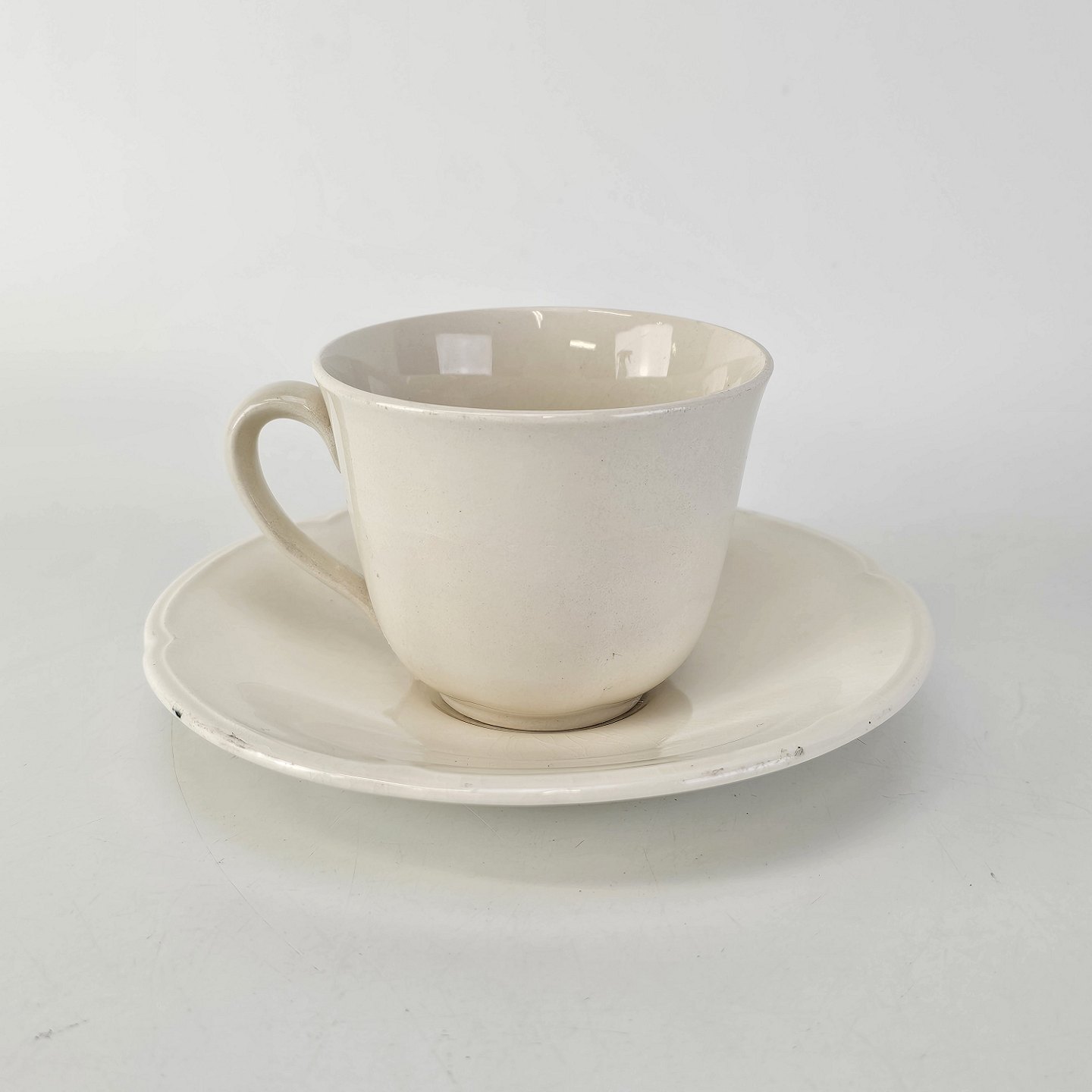 Kop og underkop i cremefarvet fajance fra stellet Alma