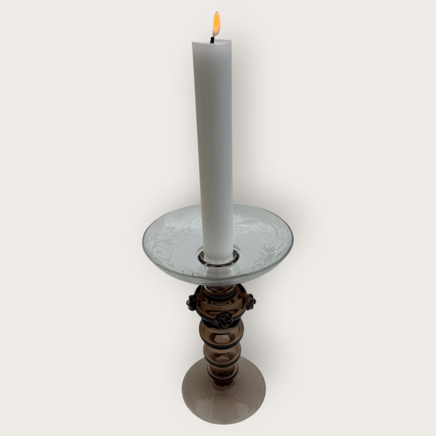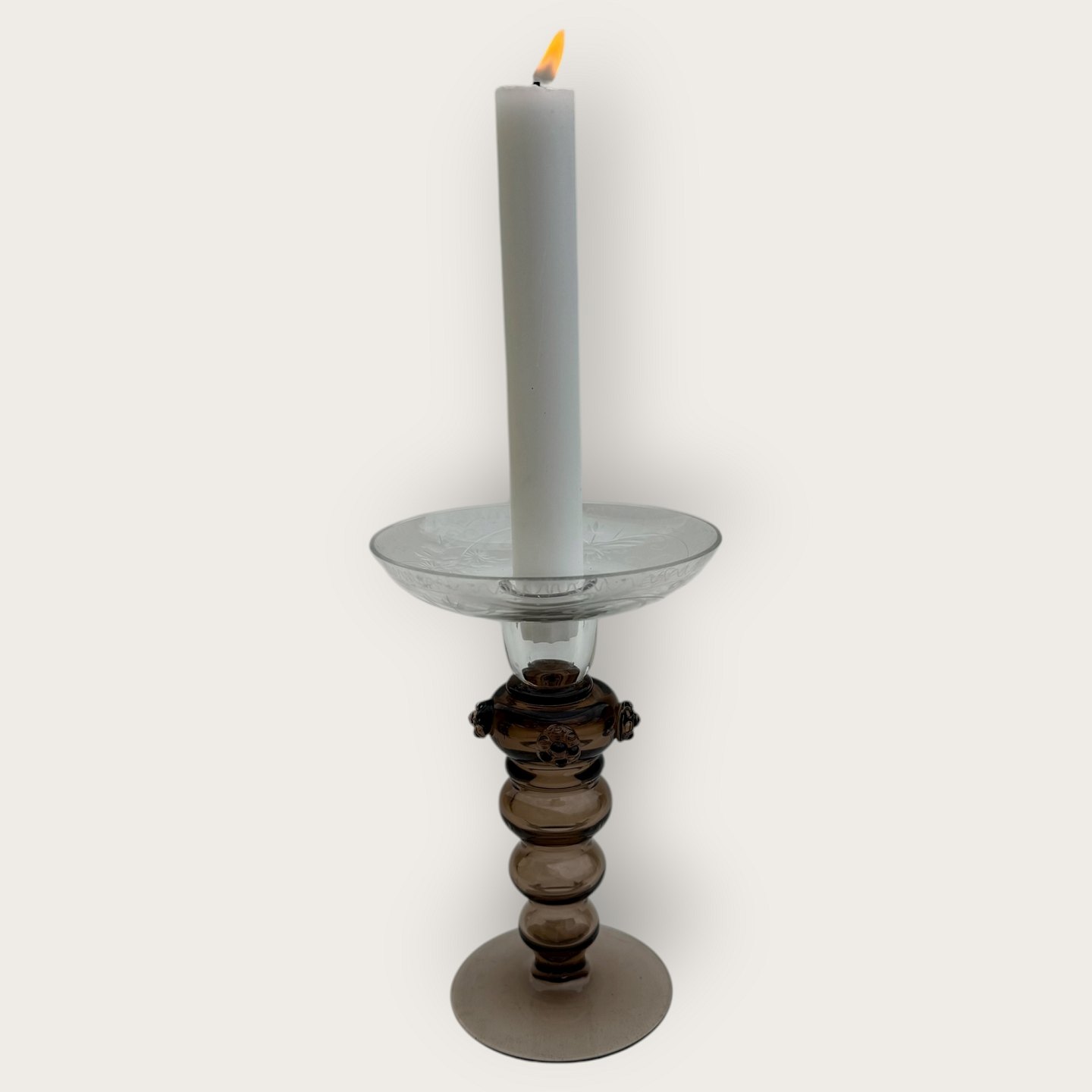 Gammel glaslysestage, hul brun stamme med rosetter, Skål med slibninger affugle, mønster og blomster, flot stand, højde 16,5cm, diameter 11cm
