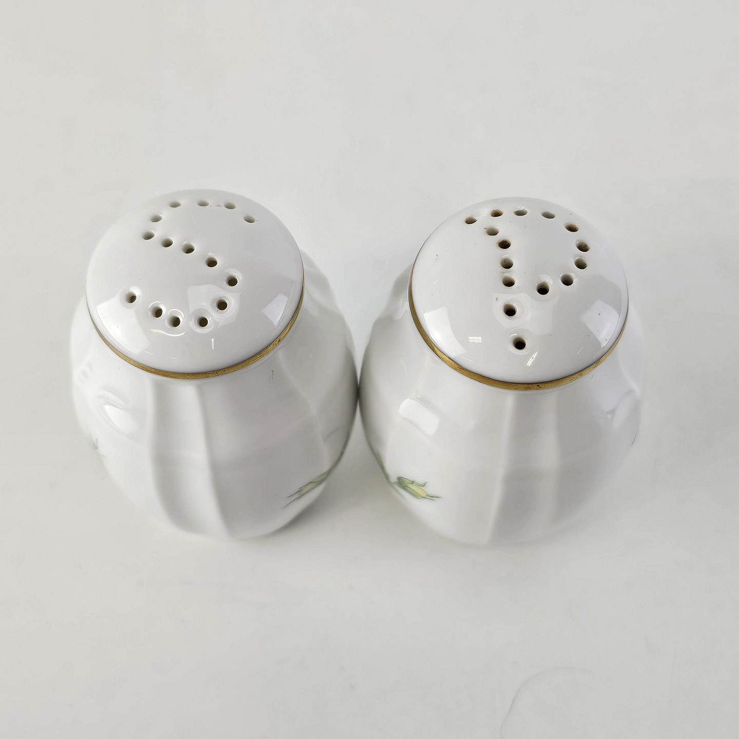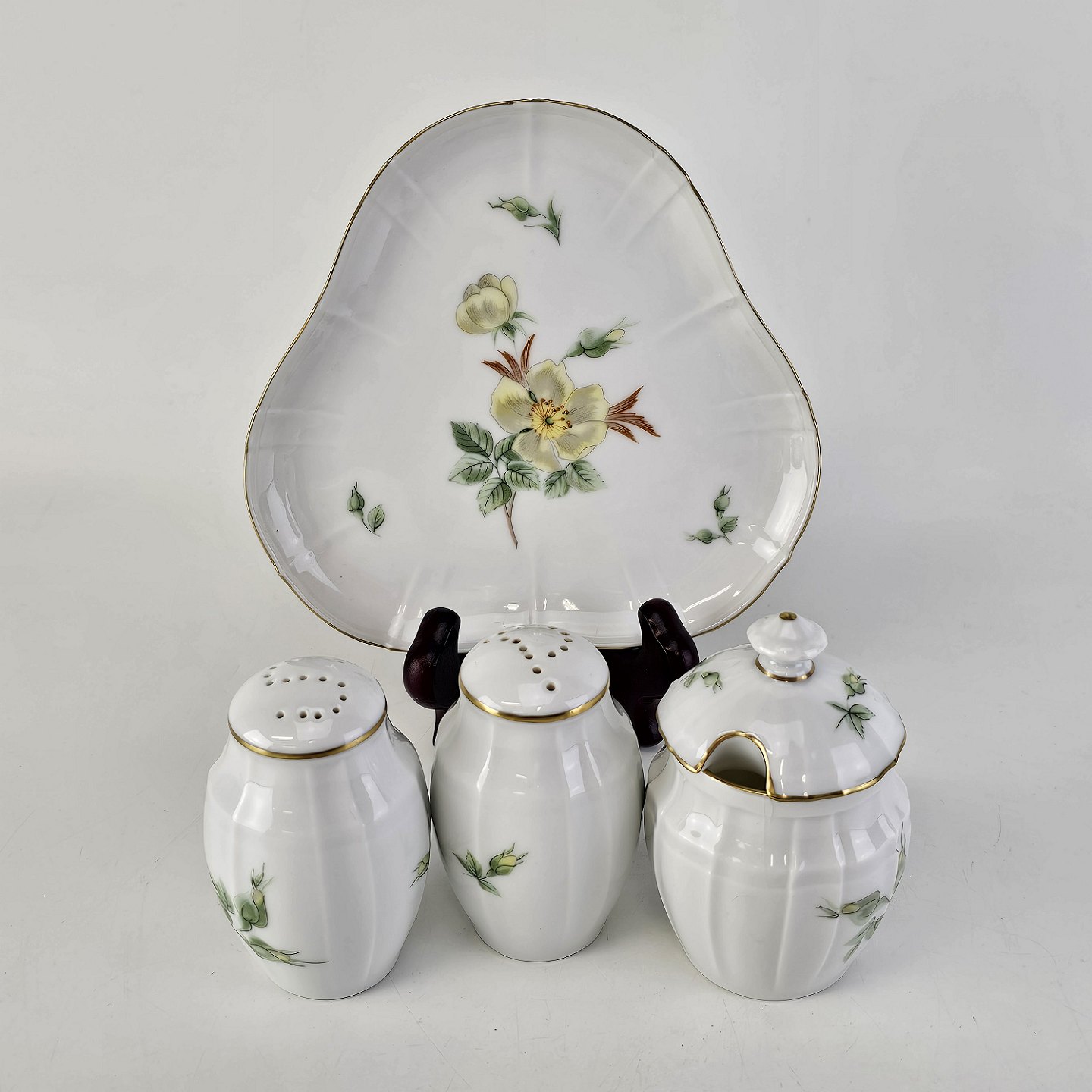 Sæt til salt, peber og sennep med tilhørende tallerken i porcelæn fra stellet Klitrose