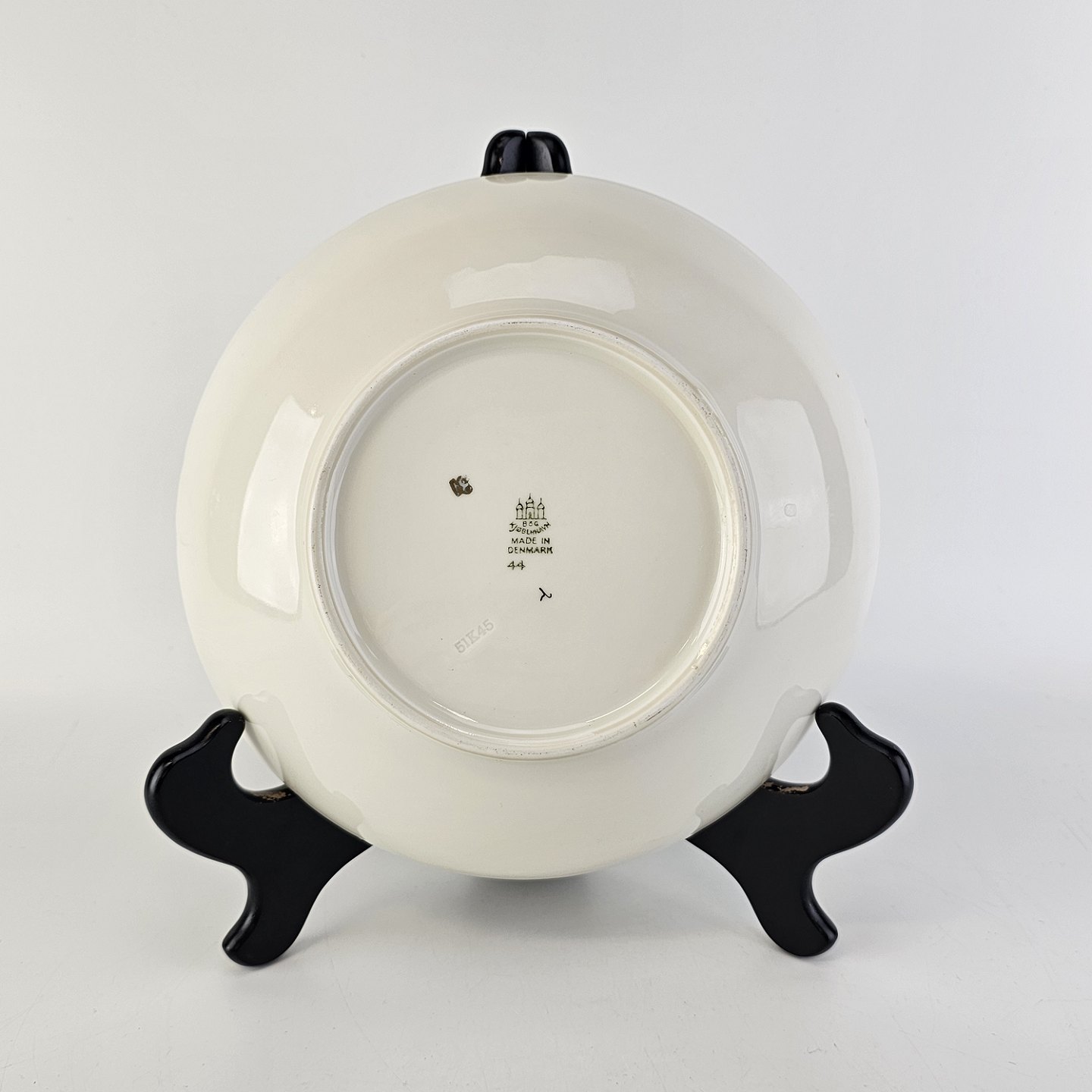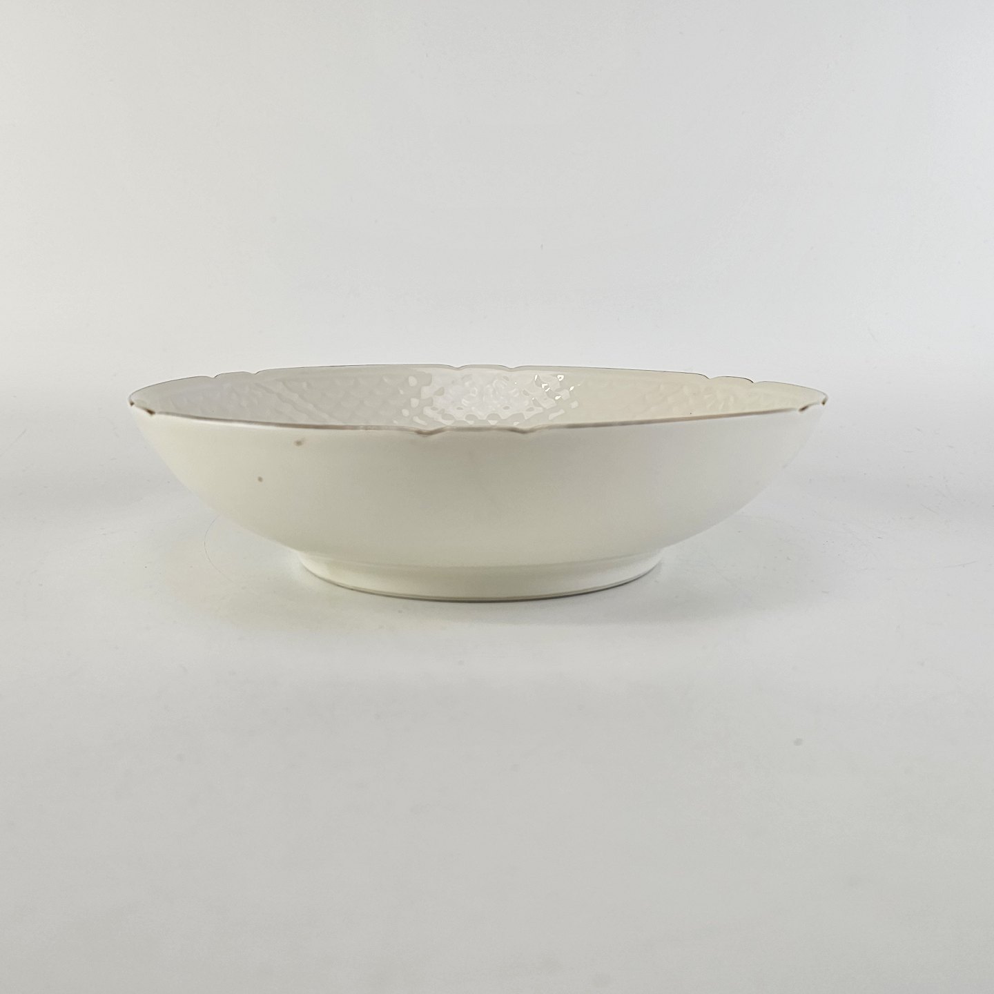 Balder er cremefarvet porcelæn i skælform, dekoreret med hyben og guldkant.