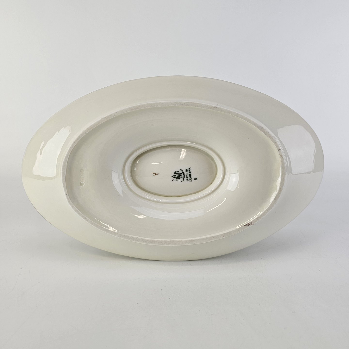 Balder er cremefarvet porcelæn i skælform, dekoreret med hyben og guldkant.
