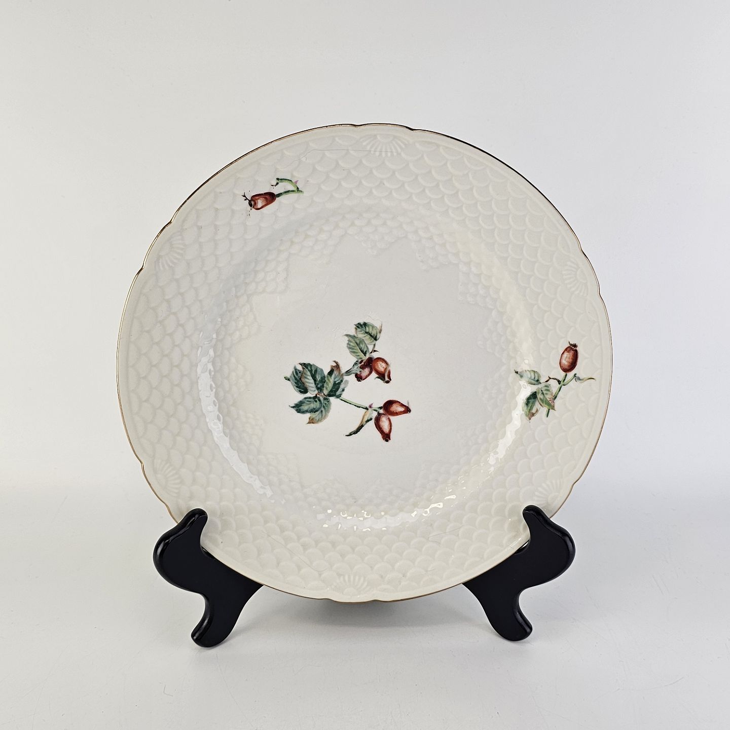 Balder er cremefarvet porcelæn i skælform, dekoreret med hyben og guldkant.