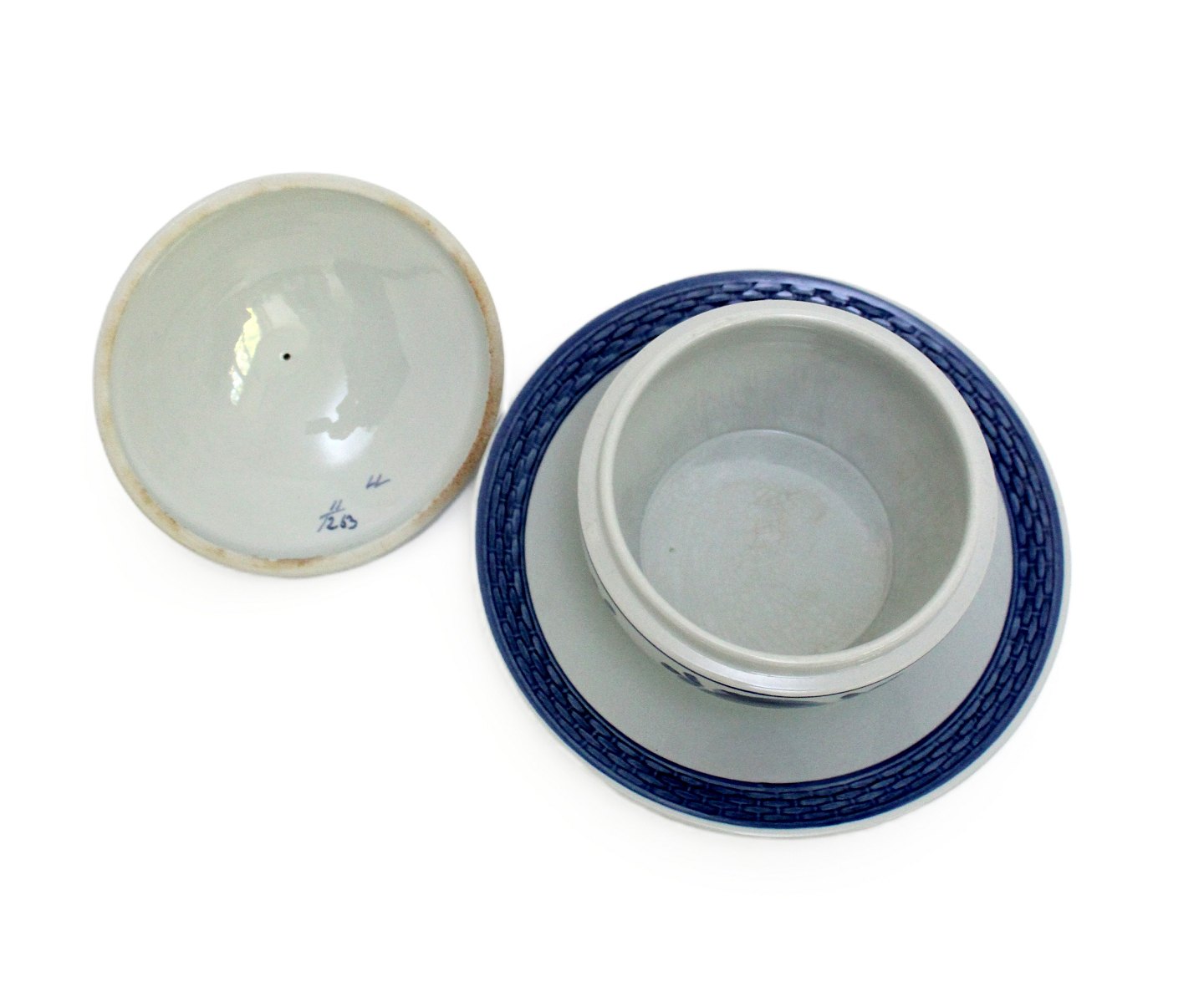 Smørskål med låg og fast underfad. Nr. 11/1263. Højde 11 cm. Diameter 11 cm. Underfad 16,5 cm. God stand med lettere misfarvet krakelering indvendig. Pris: 325 kr. stk. Lager: 1