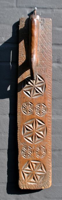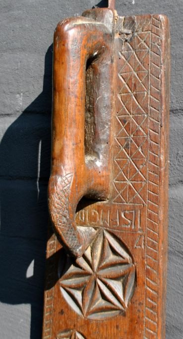 Dansk manglebræt, 1759. Manglebræt i bøgetræ med talrige karvskæringer og intialerne: ILSFM DAO 1759. Håndtag i form af skåret hest. L.: 66,5 cm. B.: 12,5 cm.