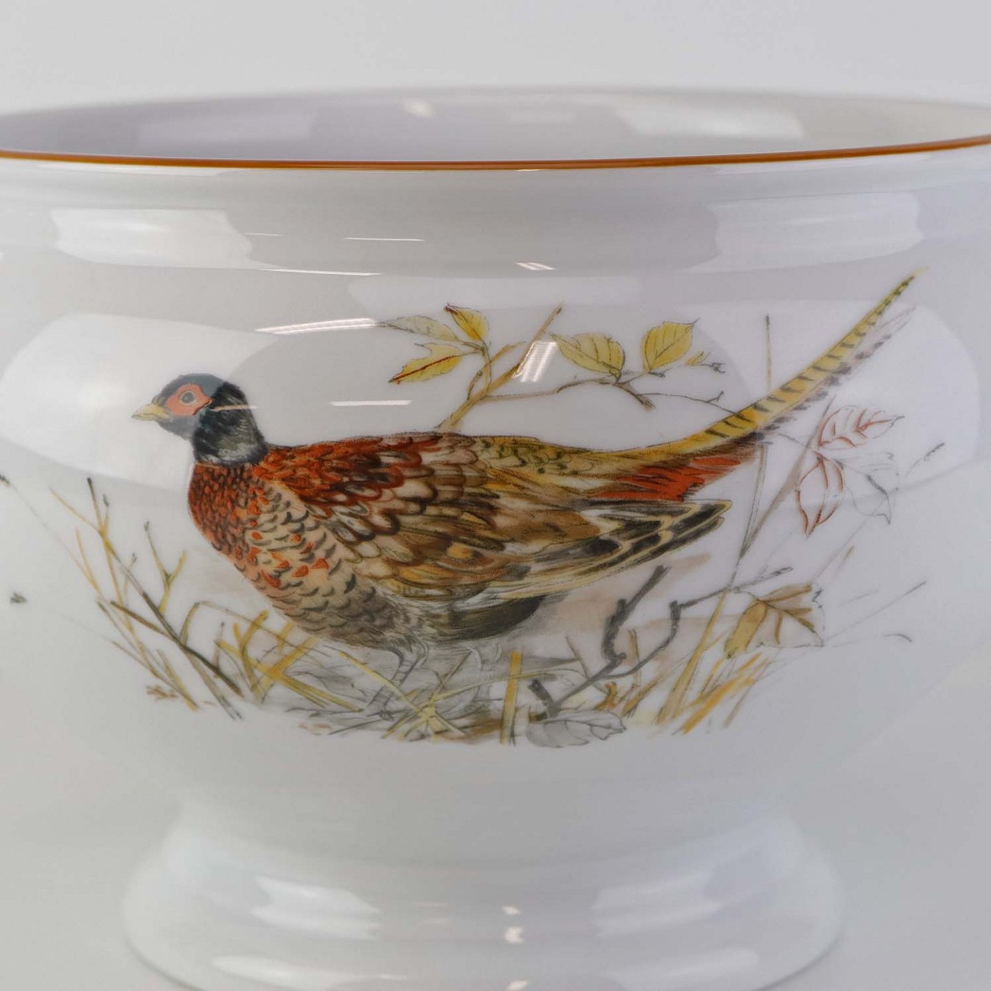 Rund skål på fod i porcelæn med hanke af grævlingehoveder og med motiv af fasan fra stellet Jagtstel. Nr. 2