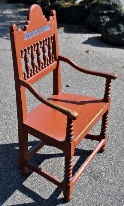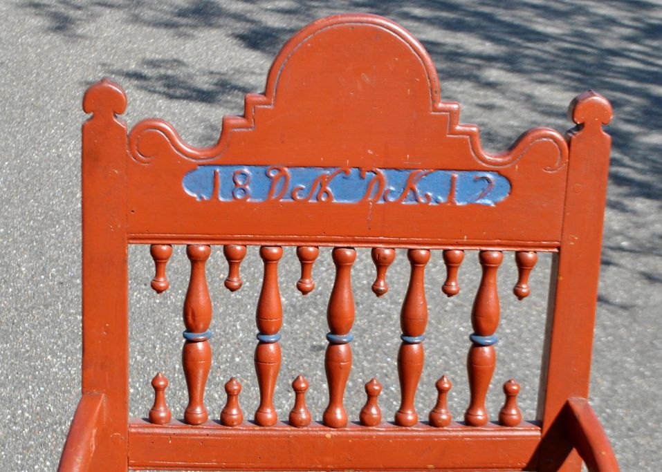 Armstol af bemalet bøgetræ 1812. Danmark. Rødmalet. 5 delt tremmeryg. Ryggen skåret med karvsnit og initialerne: DN DK 1812. H.: 106 cm. B.: 67 cm. D.: 39,5 cm.