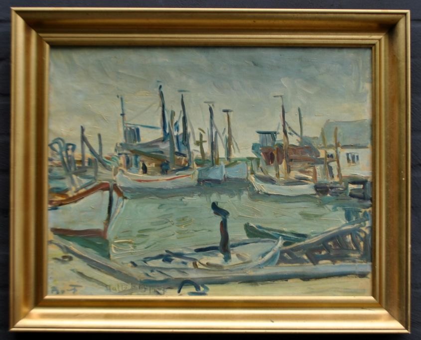Bernhardt-Frederiksen, Aage (1883 - 1963) Danmark: Havnen i Aalbæk. Olie på lærred. Signeret den 19.9.1957. 44 x 60 cm.