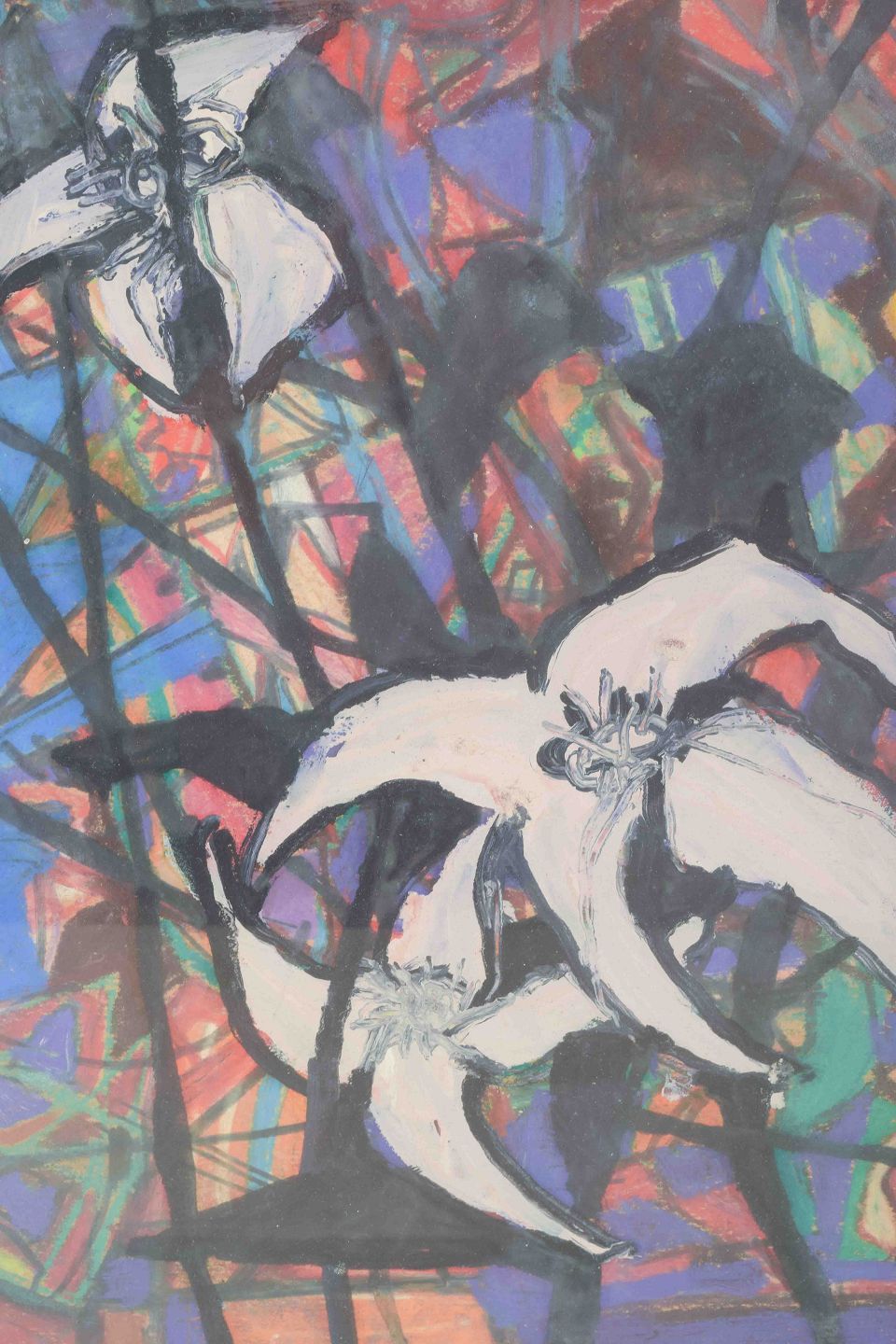 Et stemningsfuldt og dynamisk værk, hvor farver og former smelter sammen i en fri og ekspressiv komposition. De blandede teknikker giver billedfladen dybde og tekstur, og udtrykket bærer præg af tidens modernistiske eksperimenter.