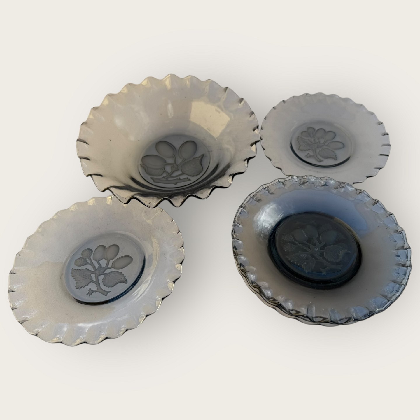Glasskål og 6 desserttallerkner med blomster / frugt motiv, flæsekant udført i gråtonet glas, skål diameter 21cm, højde 5,5cm, assietter diameter 16,5cm, *fin stand*