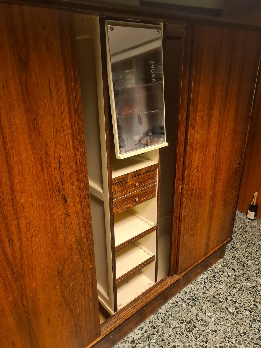 3 dørs skydelåge klædeskab fra 1960'erne i finéret palisander. Fremstår uden overskab, og med uoriginal bund i venstre side (billede) plus et par skruehuller ligeledes i venstre side. (Billede)