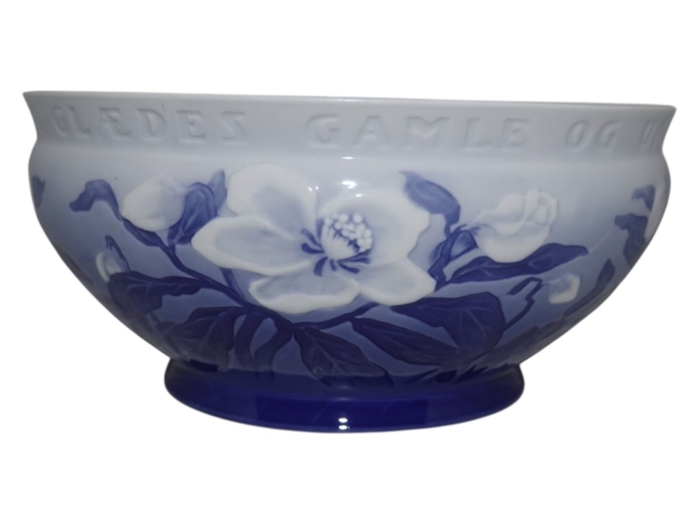 Bing & Grøndahl Julerose, sjælden stor bowle/skål med juletekst på siden: "JULEN HAR BRAGT VELSIGNET BUD - NU GLÆDES GAMLE OG UNGE".
