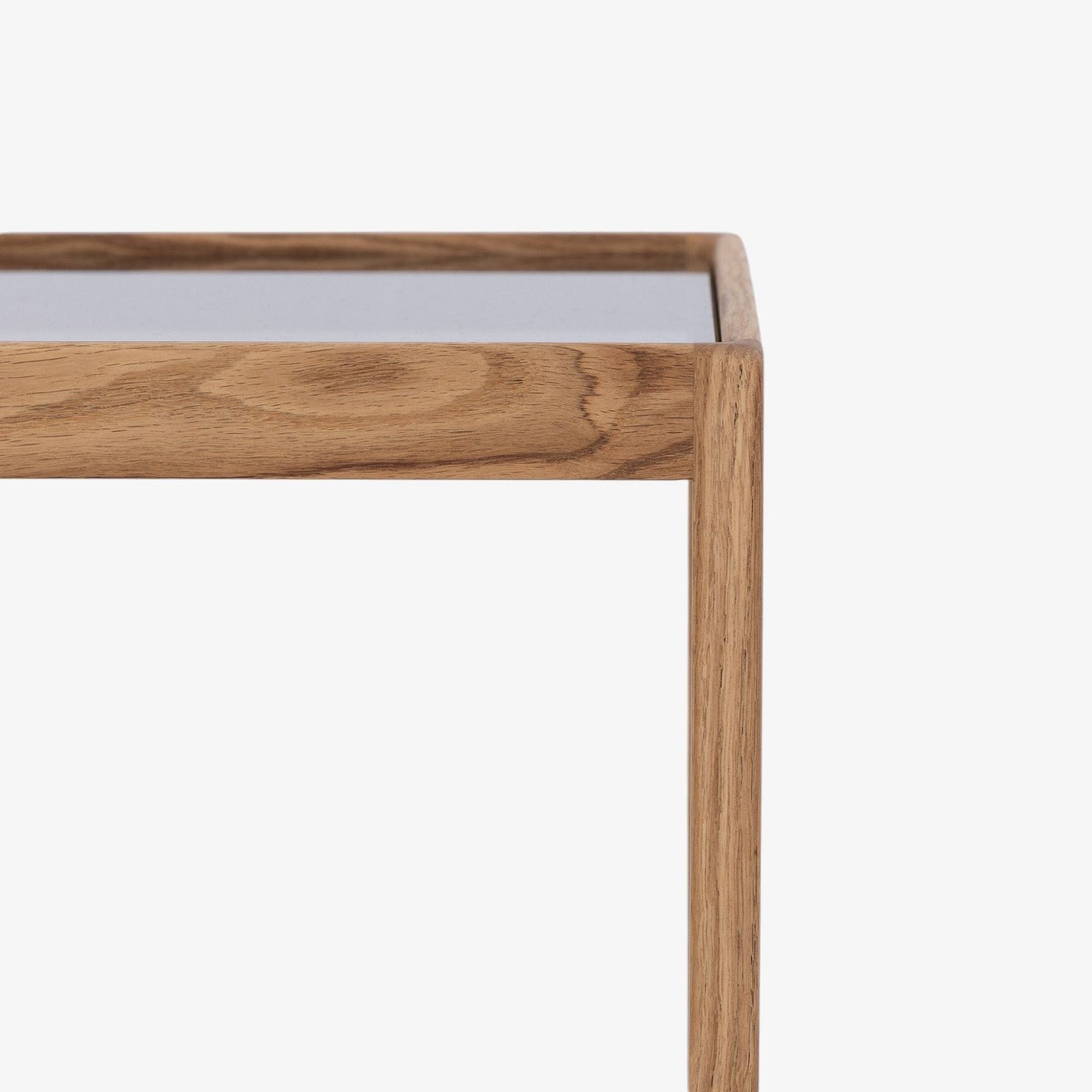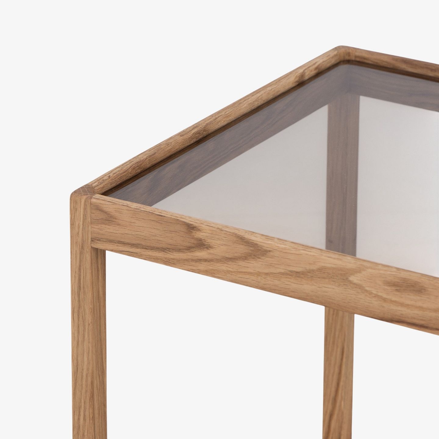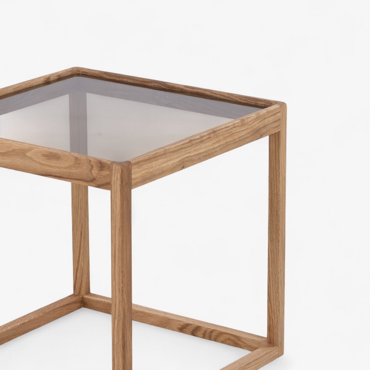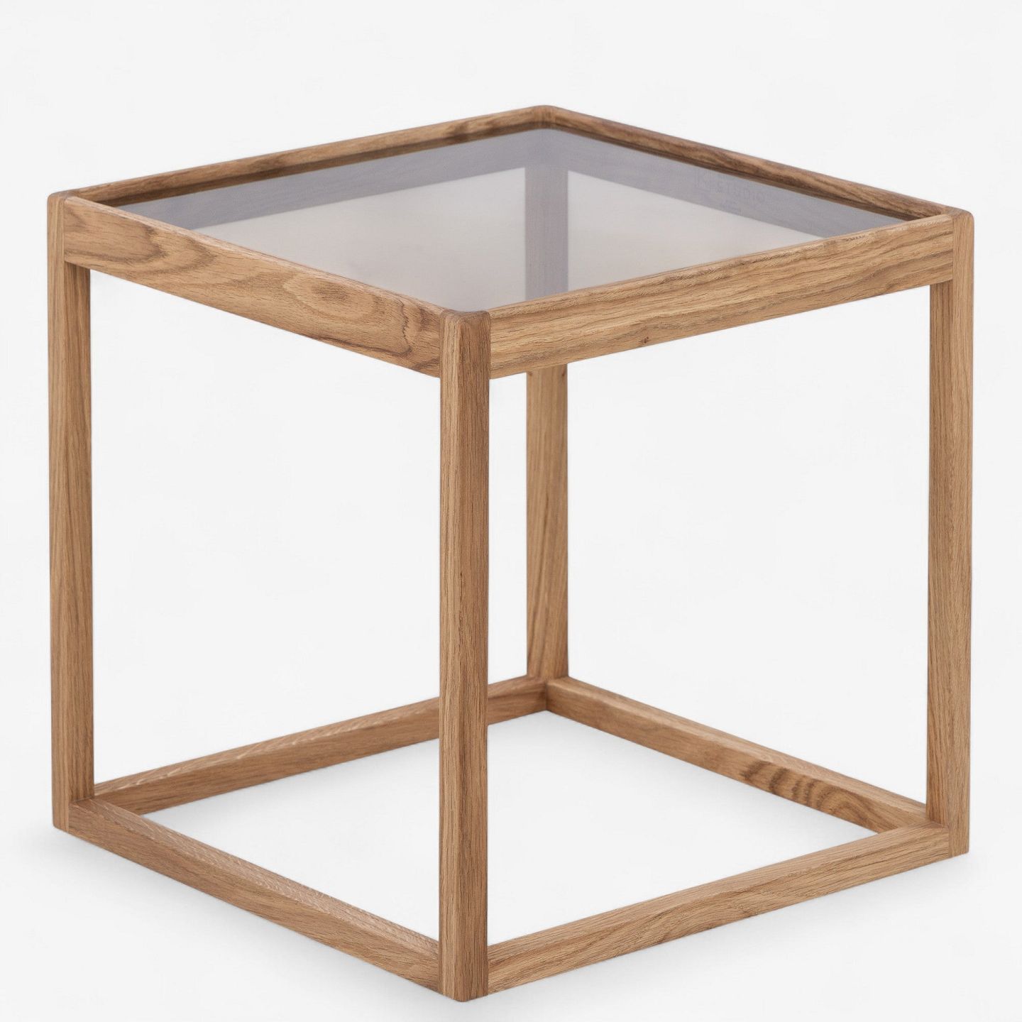 'Cube table' with oiled oak frame and smoked glass top.